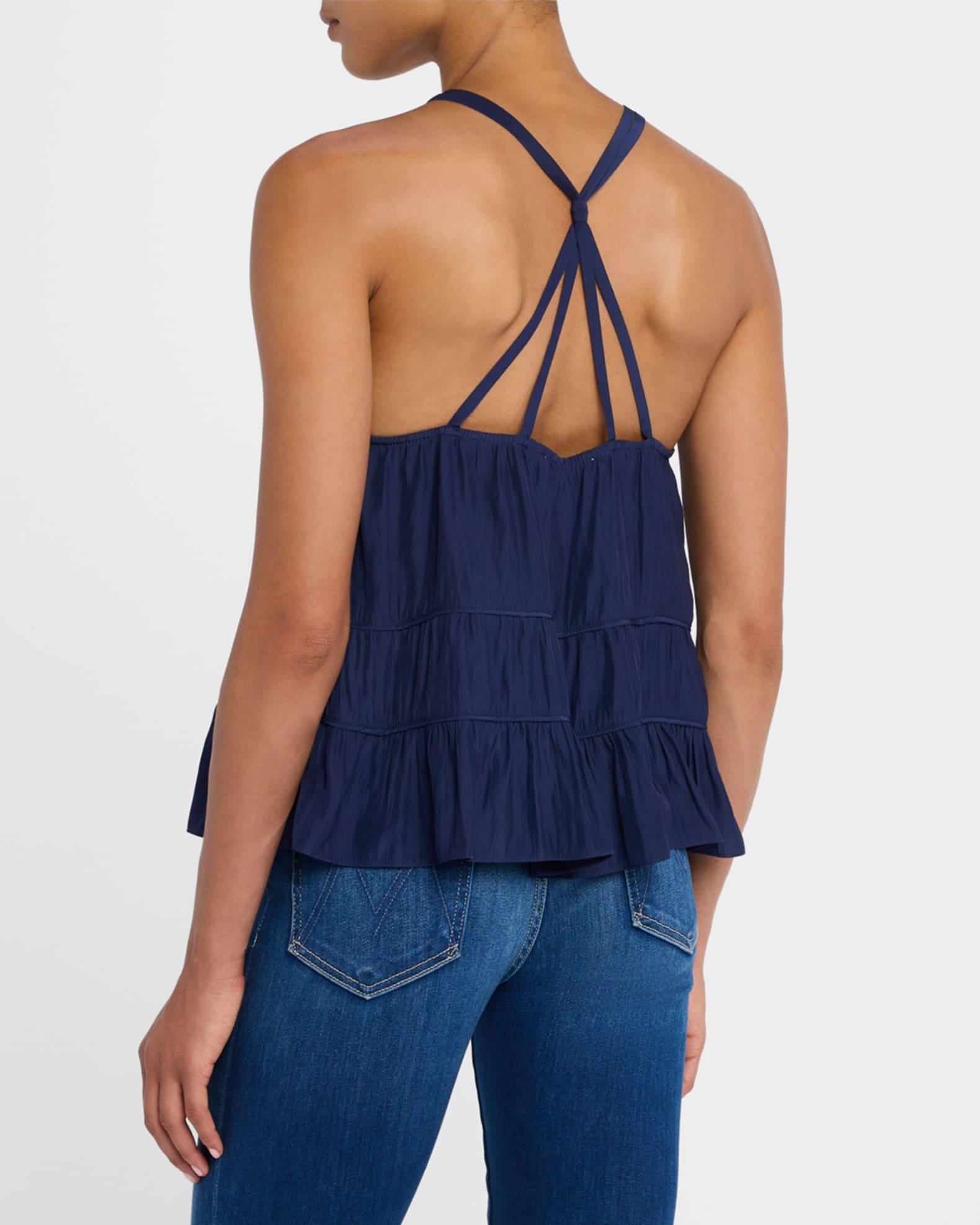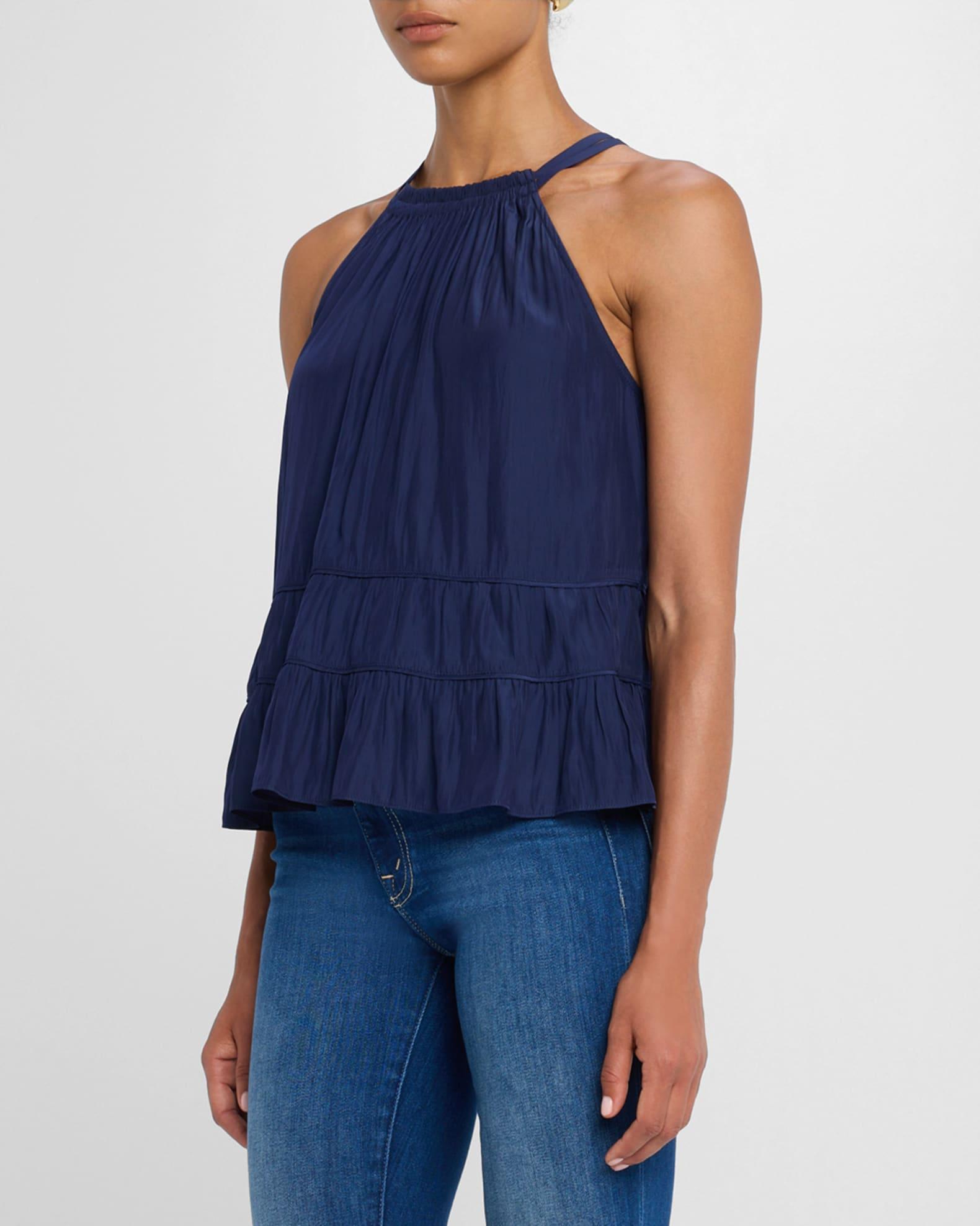 Ramy Brook "Dana" tiered blouse with gathered detailing throughout and a strappy back accent Approx. 23"L from shoulder to hem Halter neckline Sleeveless Relaxed fit Hip length Slipover style Polyester Dry clean Imported