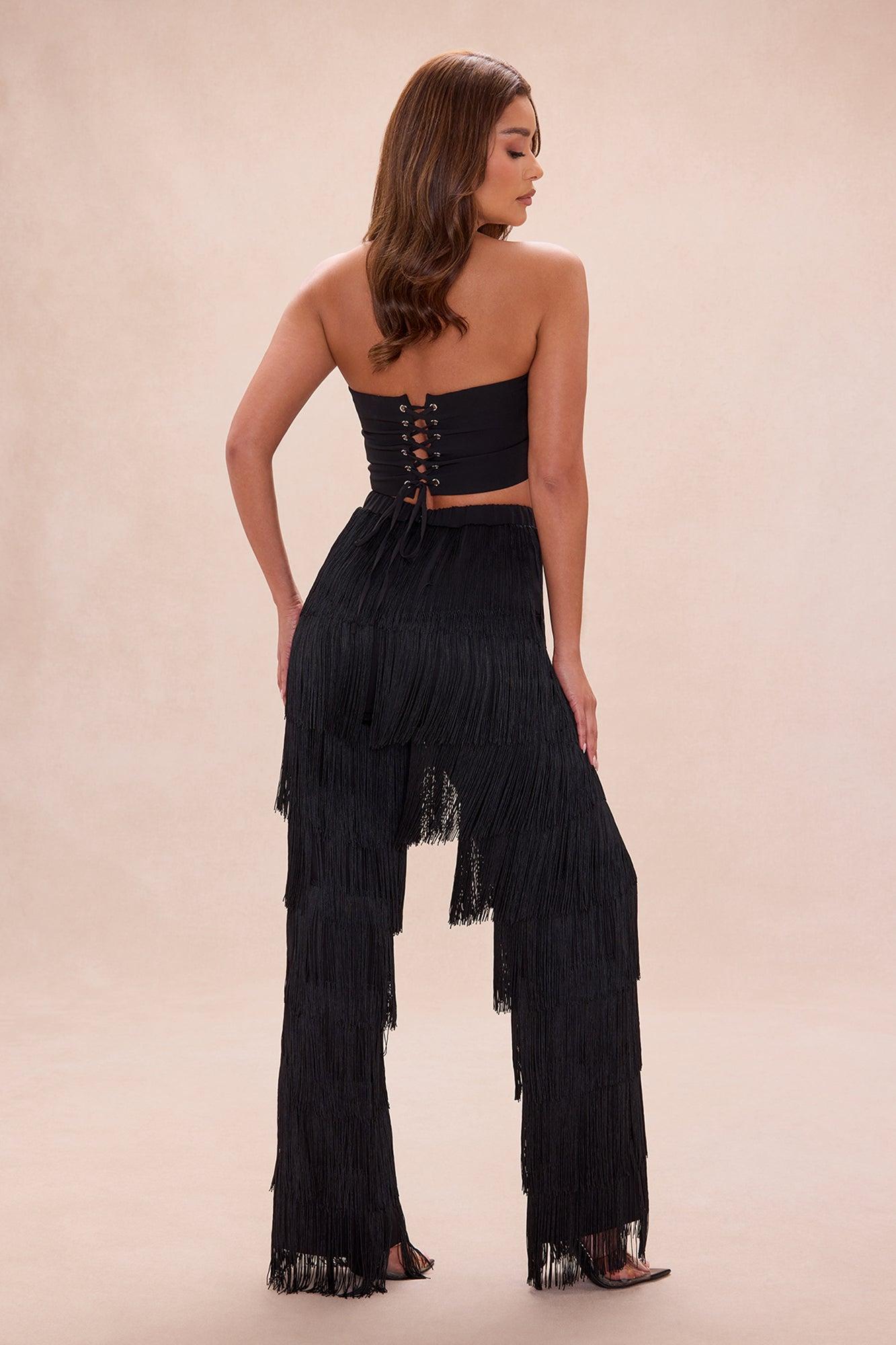 Available In Black, Chartreuse And Chocolate. Pant Ensemble Bandeau Top Strapless Straight Neckline Grip Tape Lace Up Back Lined Non Stretch Pant with Fringe Detail Elastic Waistband Hidden Back Zipper Closure Self: 92% Polyester 8% Spandex Lining: 97% Polyester 3% Spandex