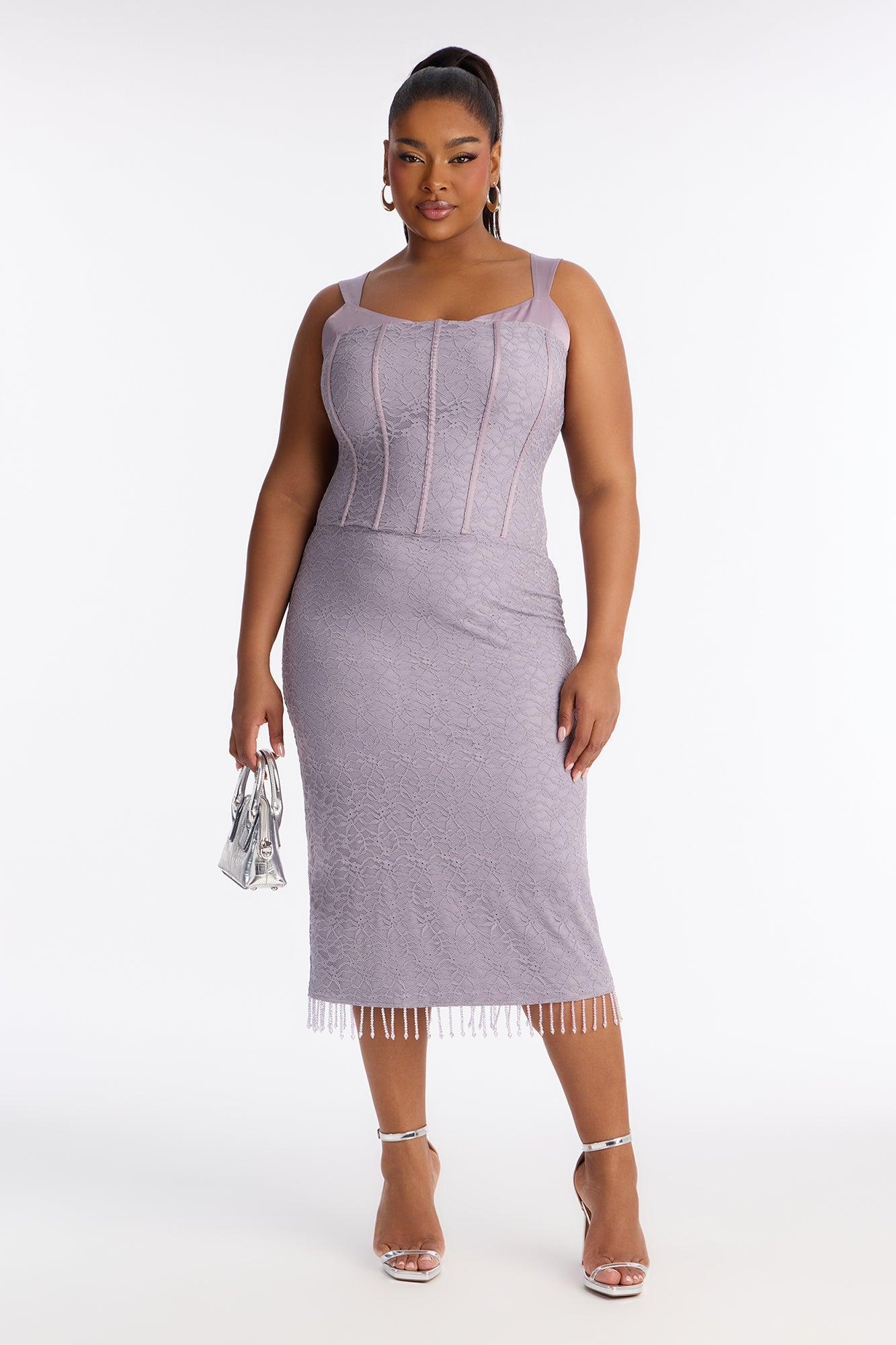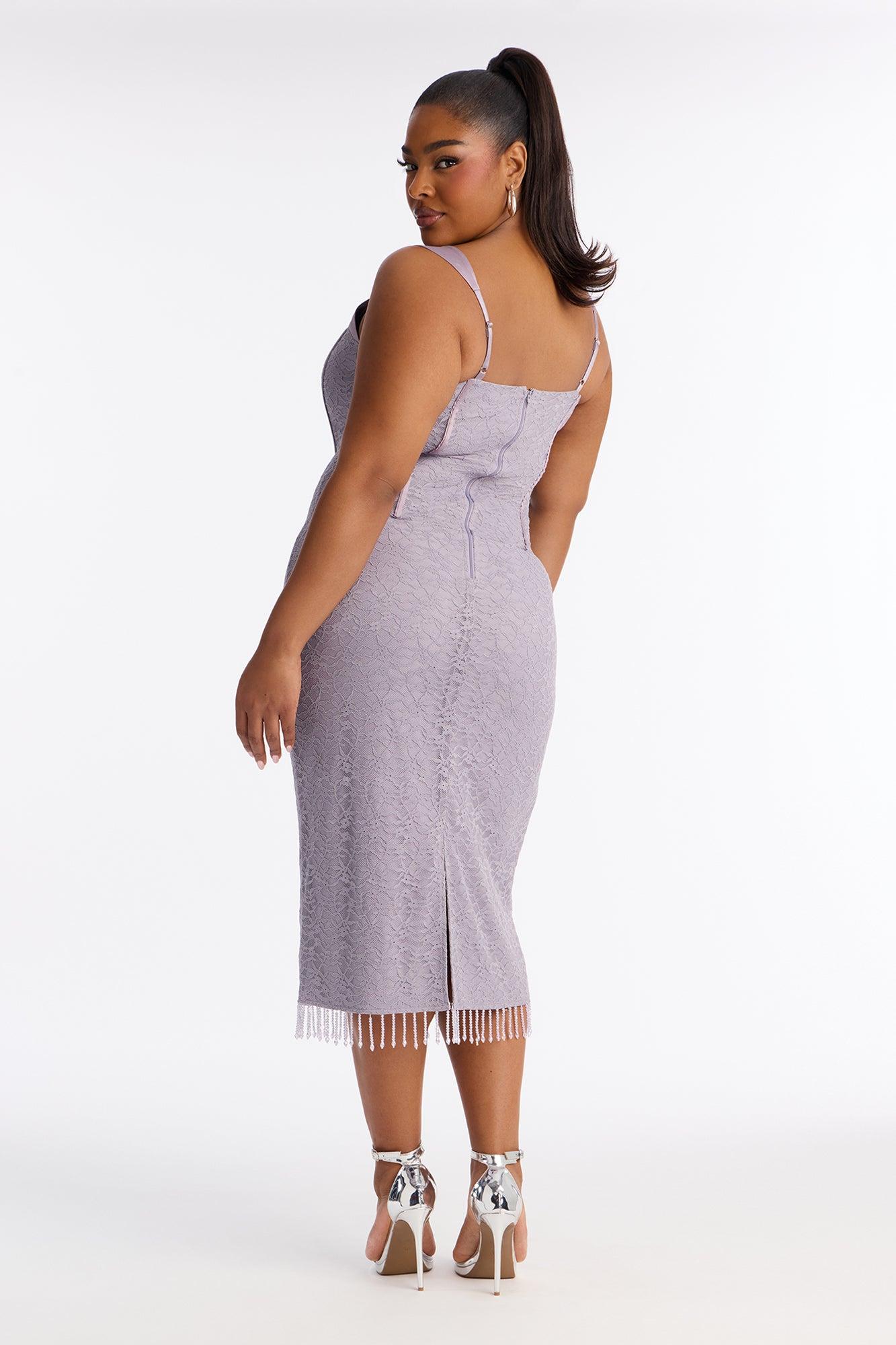 Available In Black And Lavender. Lace Midi Dress Scoop Neckline Sleeveless Adjustable Straps Satin Top Detail Corset Waist Beaded Fringe Trim Back Slit / Hidden Back Zipper Lined / Stretch Length Measured Flat = 46" Self: 90% Nylon 10% Spandex Contrast: 95% Polyester 5% Spandex Lining: 94% Polyester 6% Spandex Imported California Proposition 65WARNING: Cancer and Reproductive Harm - www.P65Warnings.ca.gov.