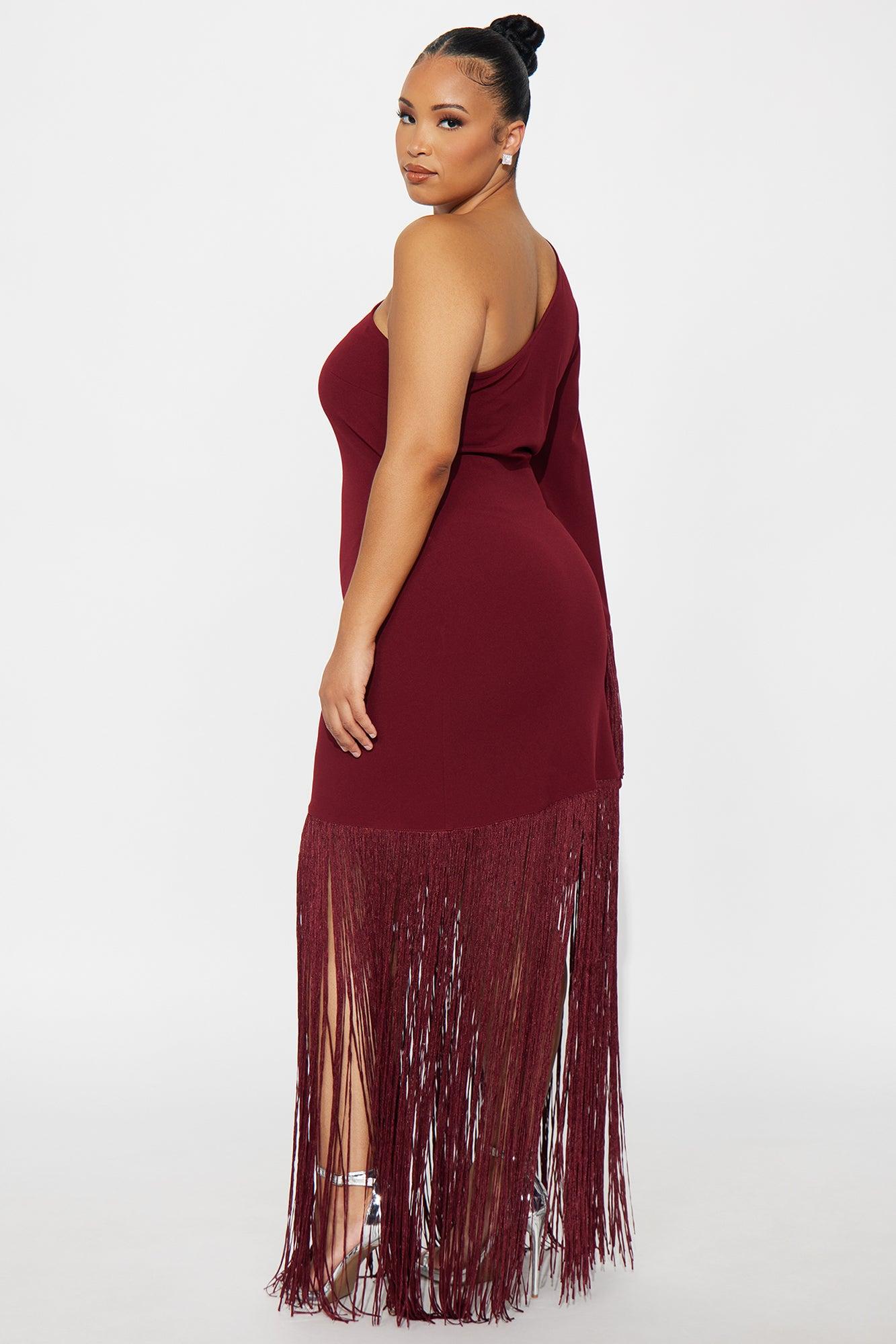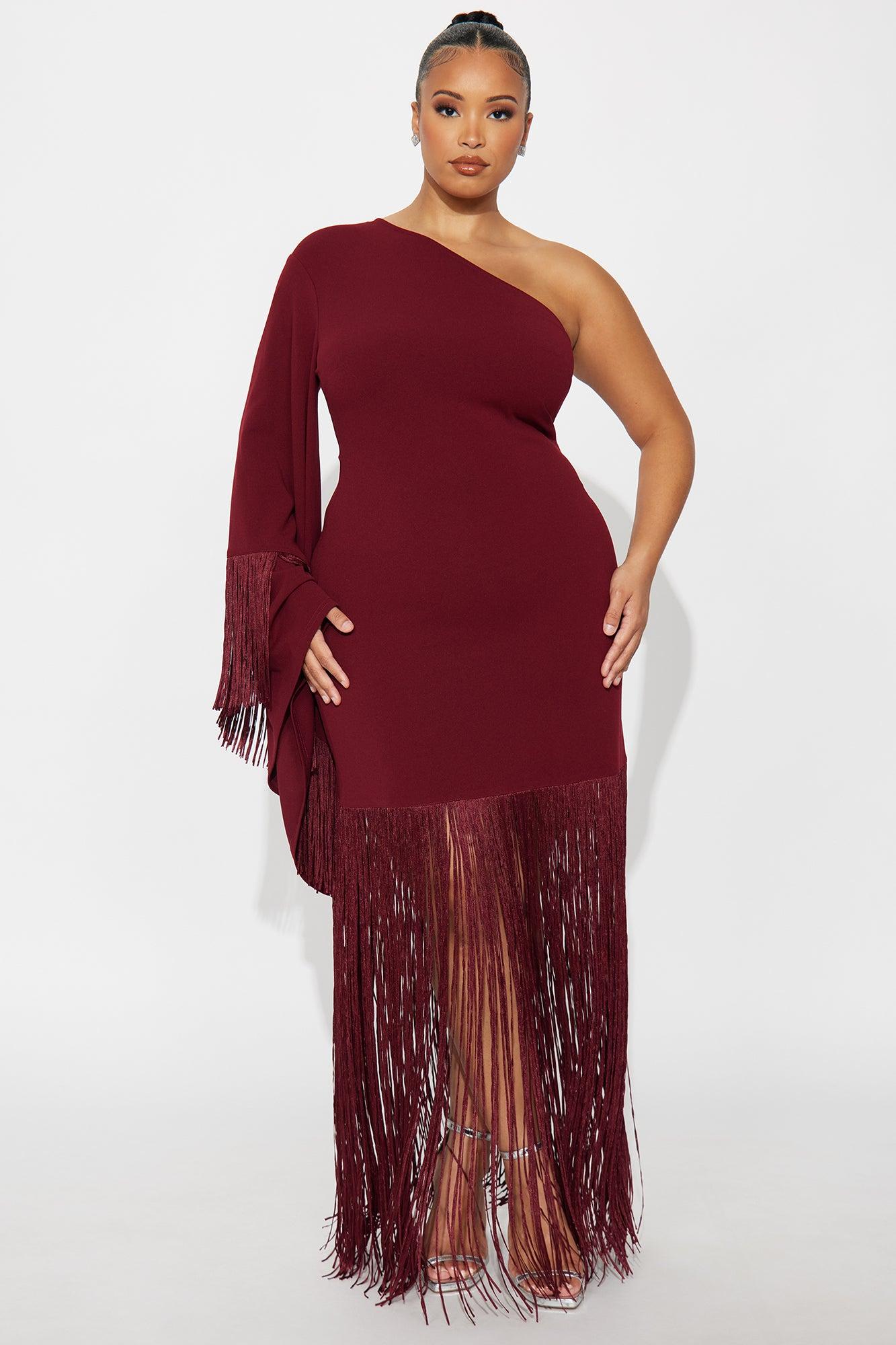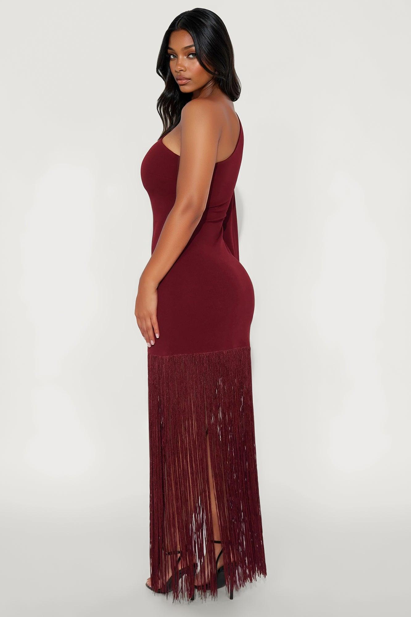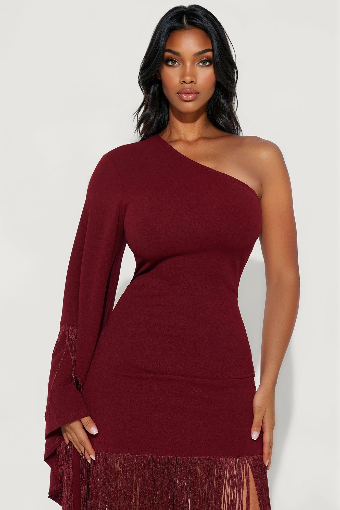 Available In Burgundy. Maxi Dress Long Sleeve Draped Sleeve One Shoulder Neckline Fringe Skirt Stretch Self: 95% Polyester 5% Spandex Imported