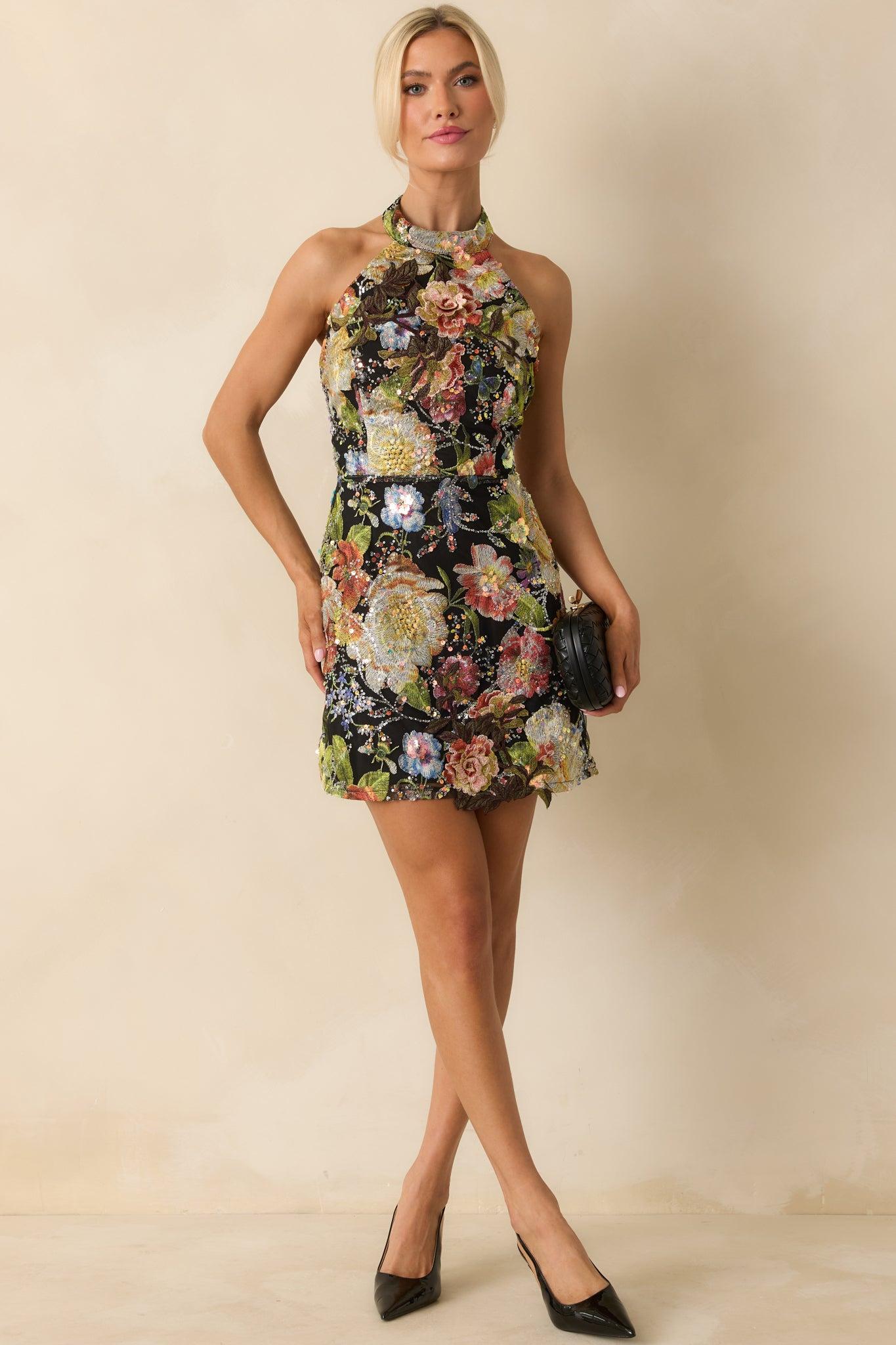 Turn every entrance into a statement in the Daring To Bloom Black Multi Floral Sequined Halter Mini Dress. This shimmering floral masterpiece pairs a bold halter neckline with a daring open back, creating the perfect balance of elegance and edge. Covered in glimmering sequins that catch the light from every angle, it’s a dress designed for the woman who doesn’t wait for permission to shine. Romantic, radiant, and undeniably confident — this is your moment to bloom boldly. This black multi floral sequined halter mini dress is made from a fully embellished sequin fabric with a floral motif and features a high halter neckline, open back, and fitted mini silhouette. It is fully lined for comfort and finished with a concealed back zipper for easy wear. 100% Polyester Lined: 100% Polyester Hand Wash Cold Manufactured in China Designed in The USA Model is 5'8" and Wearing a Size Small, Clipped, Model is a True X-Small
