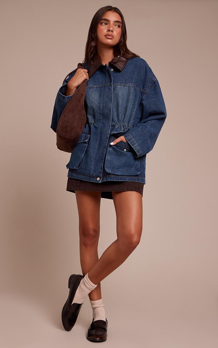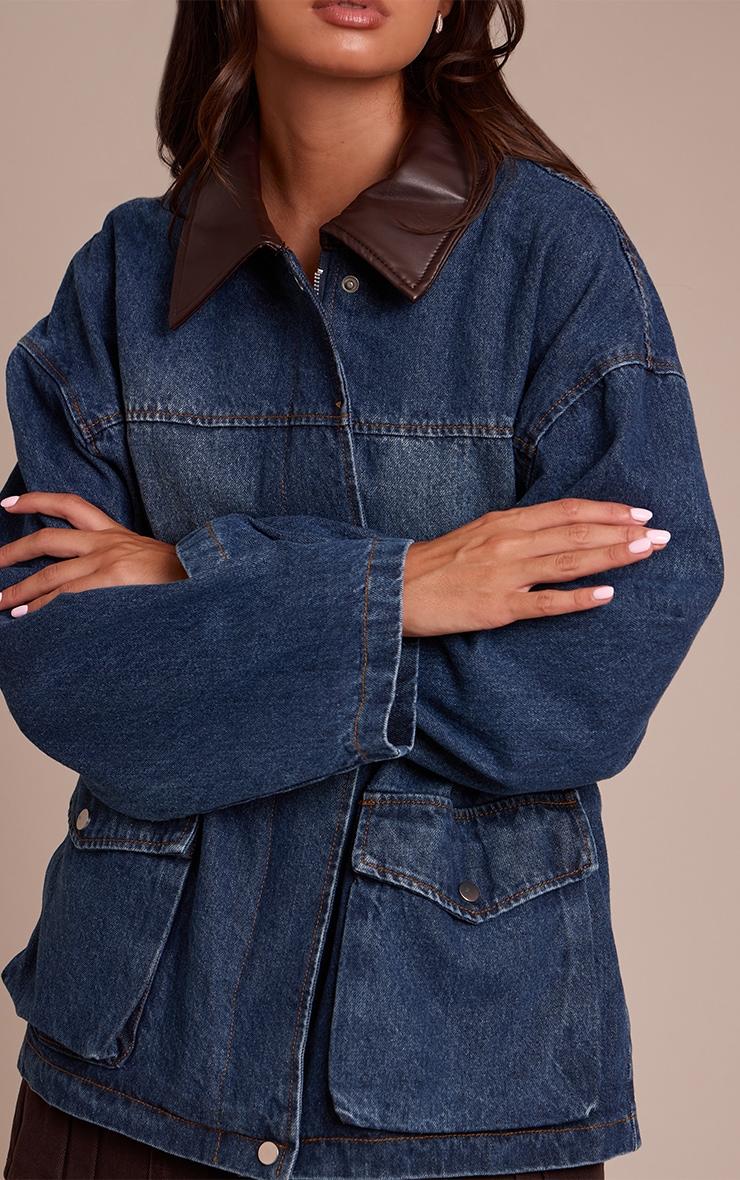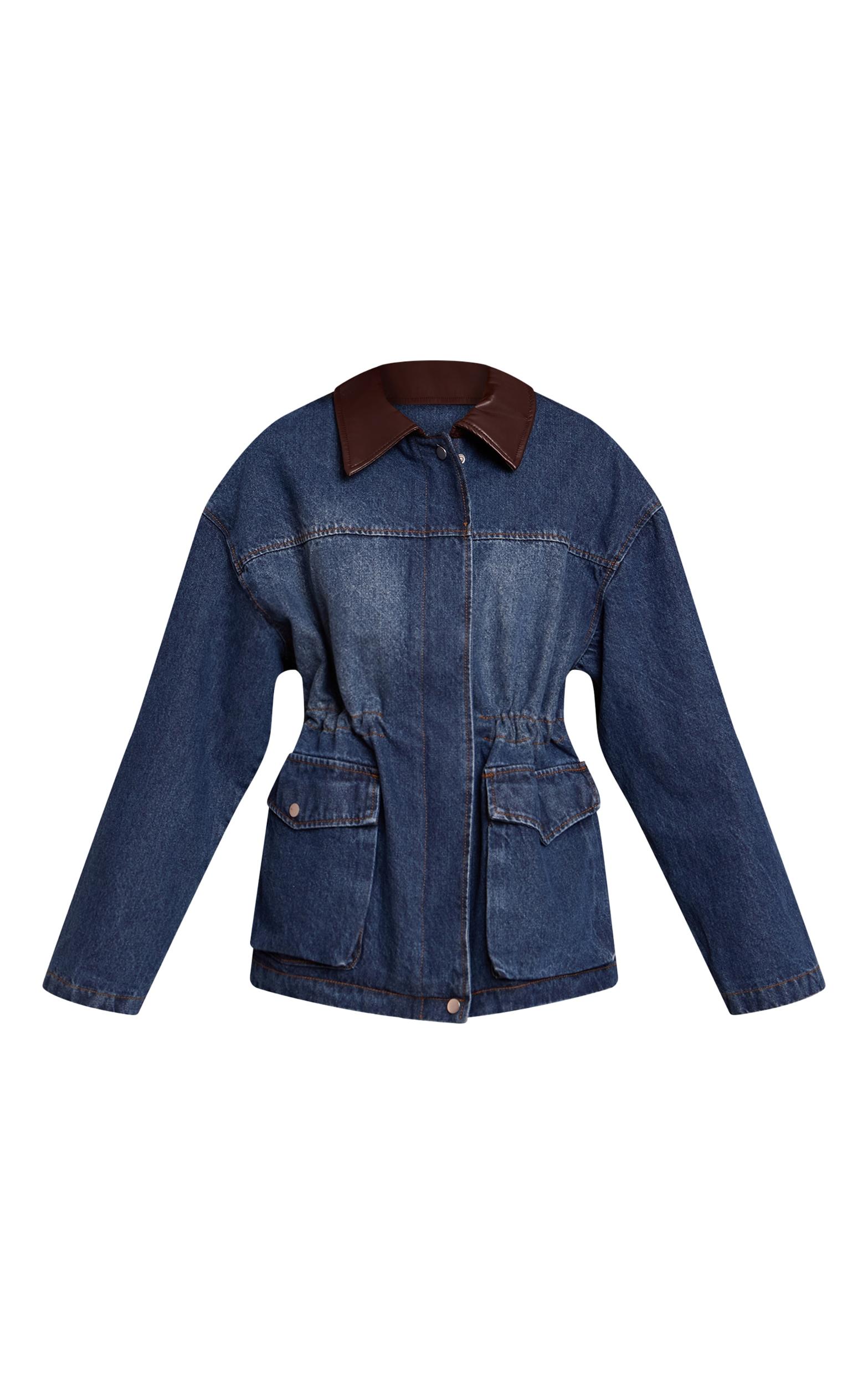 Elevate your outerwear game with this dark blue PU contrast collar cinched denim jacket. Crafted from premium denim with a structured silhouette, it features a bold PU collar that adds a modern, edgy twist. The cinched waist creates a flattering, tailored fit, enhancing your shape while maintaining effortless style. Finished with classic button closures and long sleeves with cuff details, this jacket is perfect for layering over tops, dresses, or casual tees. Pair it with skinny jeans, mini skirts, or wide-leg pants for a chic, contemporary look that effortlessly transitions from day to night.Length approx 48.5cm/19inch (Based on sample size US 4)Model wears size UK 8/ EU 36/ AUS 8/ US 4Model Height - 5ft 7inchp]:!mb-4inch>Category: DenimProduct type: Denim JacketColor: Dark BlueMaterial: Rigid DenimDesign: PlainNeckline: CrewSleeves: LongOccasion: Day