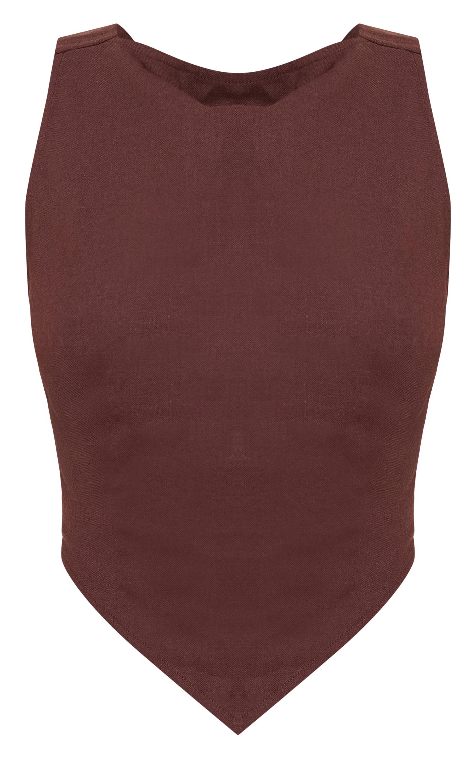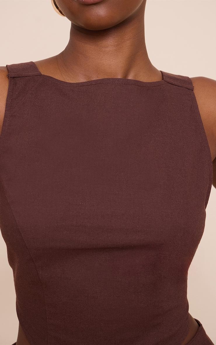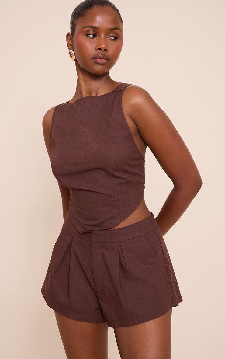 Own the moment with a knowing twist. The dark brown linen look woven open back top defines confident daywear with its sleek cut, featuring wide straps that elegantly frame the shoulders and connect to a secure central clasp, revealing an artful open back design. Perfect for a cohesive look with the matching dark brown shorts, or elevate your day agenda by pairing it with crisp tailored wide-leg pants. It’s the essential piece for an undeniably distinct aesthetic.Length approx 48.5cm/19inch (Based on sample size US 4)Model wears size UK 8/ EU 36/ AUS 8/ US 4Model Height - 5ft 9inchp]:!mb-4inch>Brand: PrettyLittleThingCategory: Co-ordsProduct type: Vest TopColor: Dark BrownMaterial: Tailored WovenNeckline: CrewSleeves: SleevelessOccasion: Day