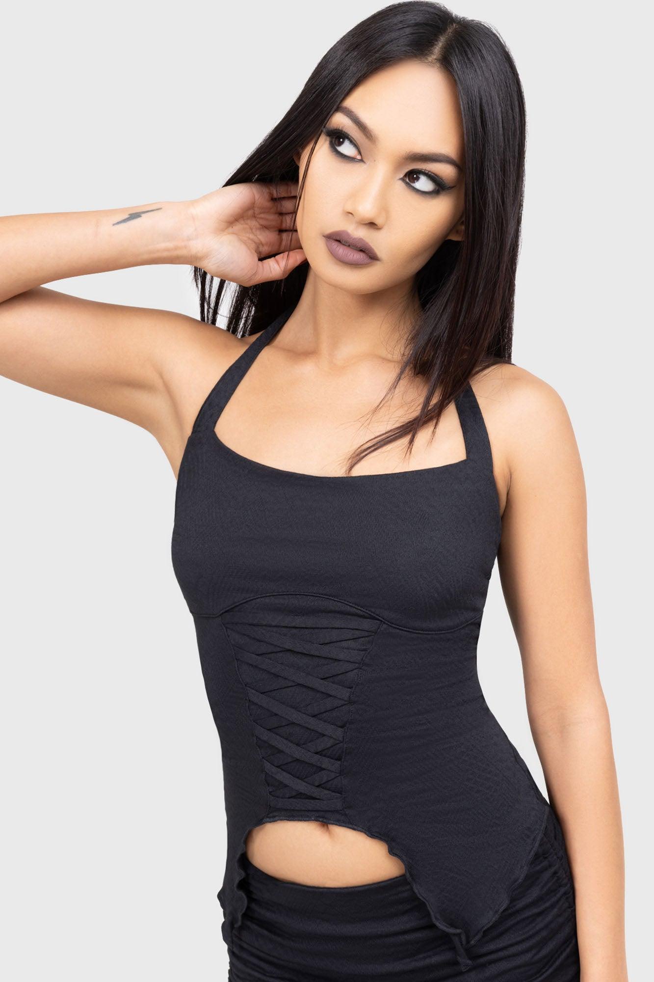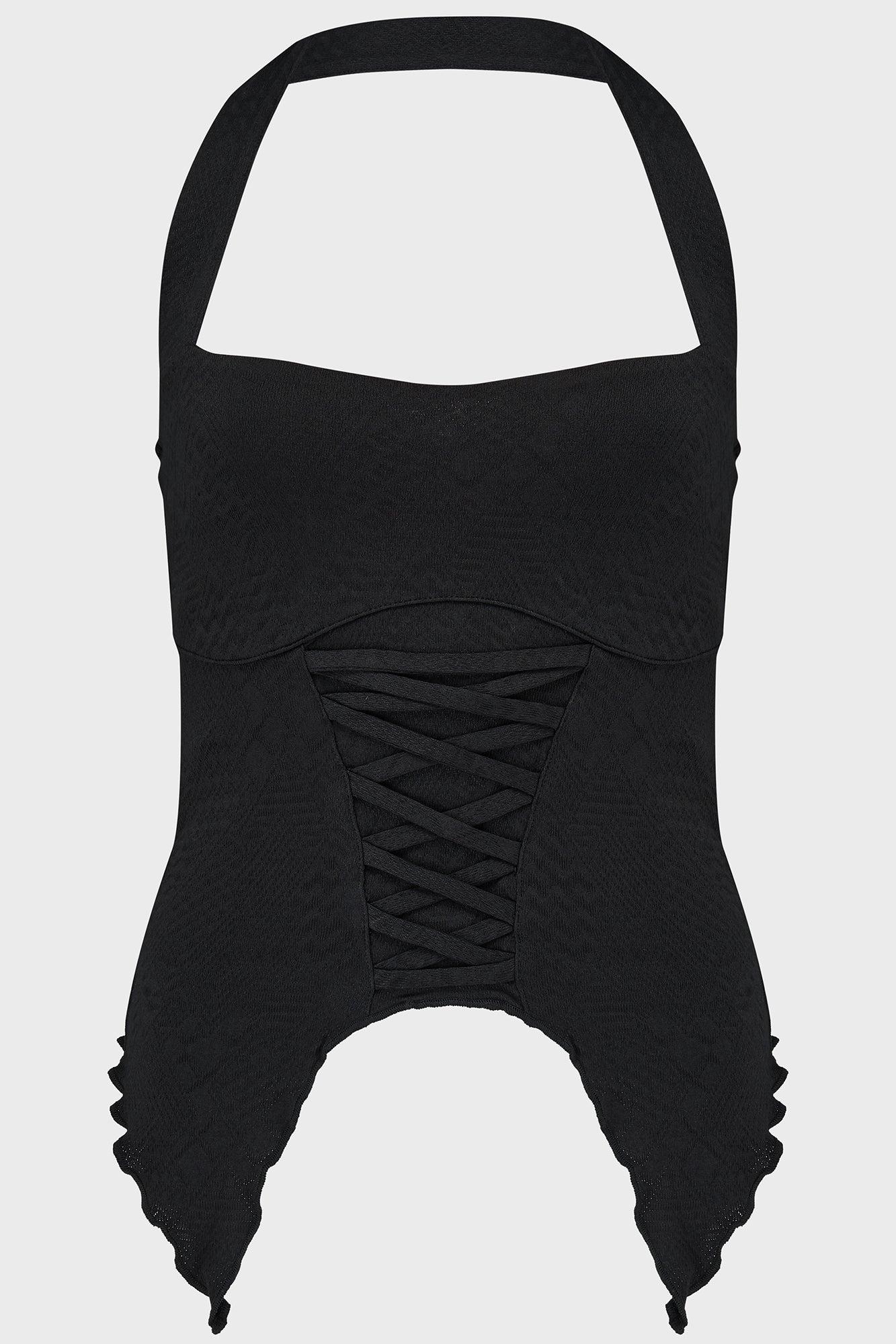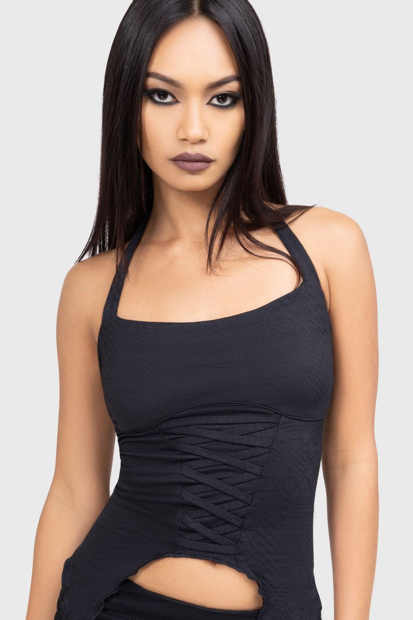 DARK DAHLIA- Soft-stretch Jacquard jersey.- Halter neck strap.- Cropped length.- Uneven hem.- Lettece hem detail.- Front cross seam detail.- Underbust seam detail.- Fitted.Model is 5’6 and wears a size XS.With KILLSTAR branding, 65% viscose 28% polyester 7% elastane.Machine wash cold (30°c) / Do not bleach / Do not tumble dry / Iron at low temperature / Do not dry clean. Imported.