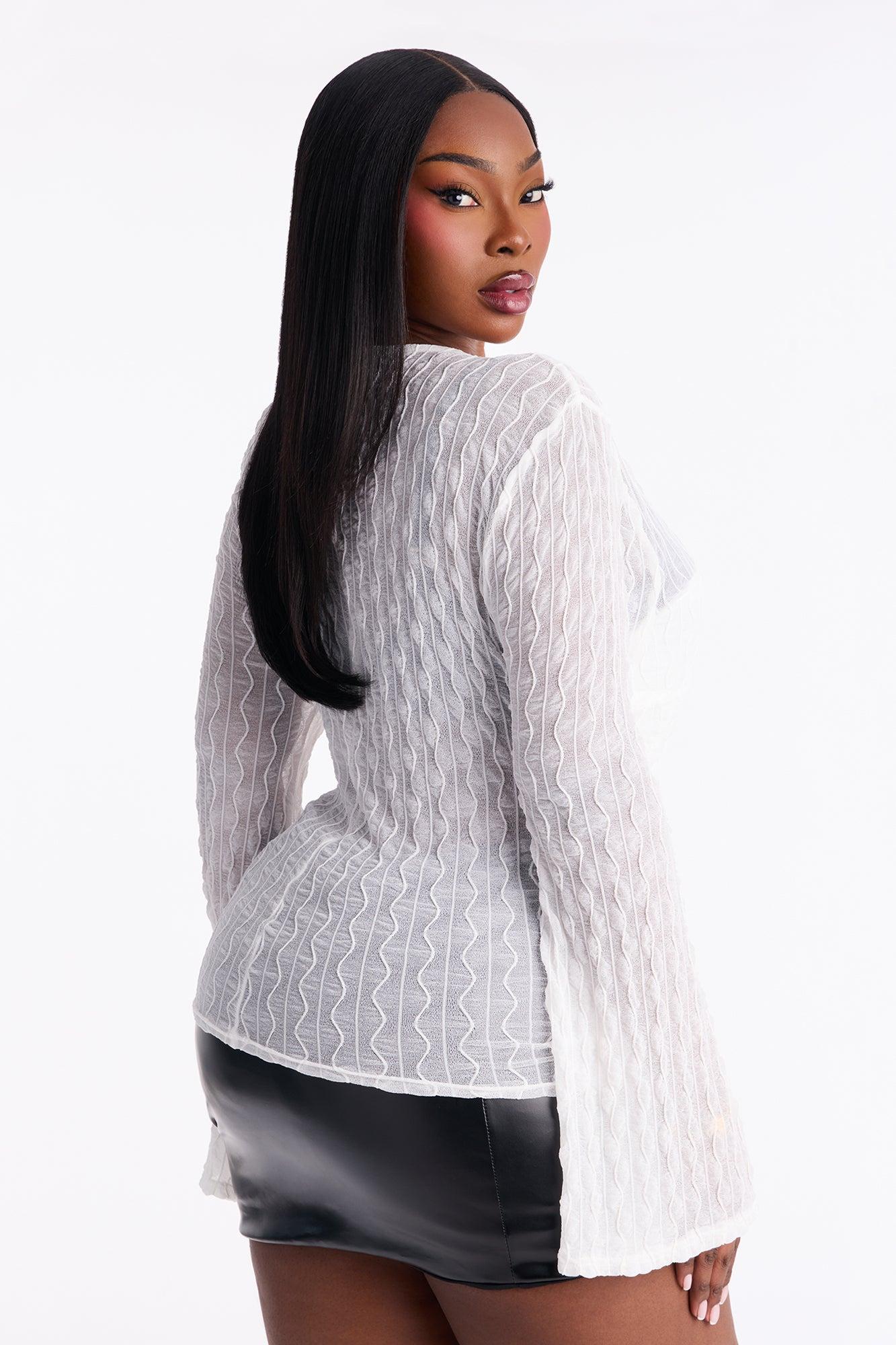 Available In Black, Brown And White. Flyaway Top Stretch Hook And Eye Front Closure Long Sleeve Self : 95% Nylon 5% Spandex Lining : 100% Polyester Imported California Proposition 65WARNING: Cancer and Reproductive Harm - www.P65Warnings.ca.gov.