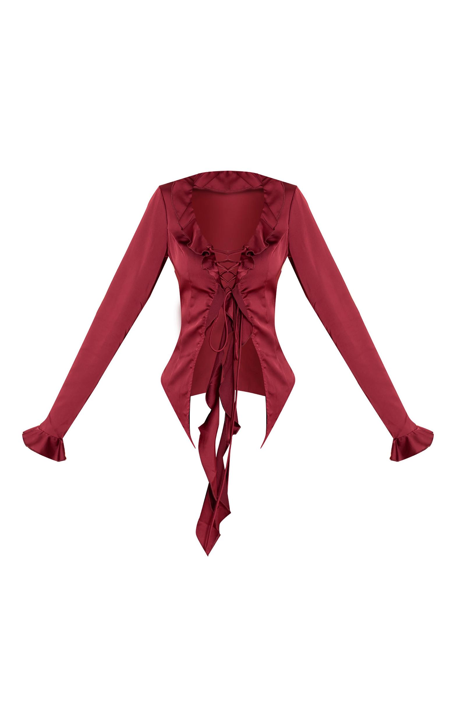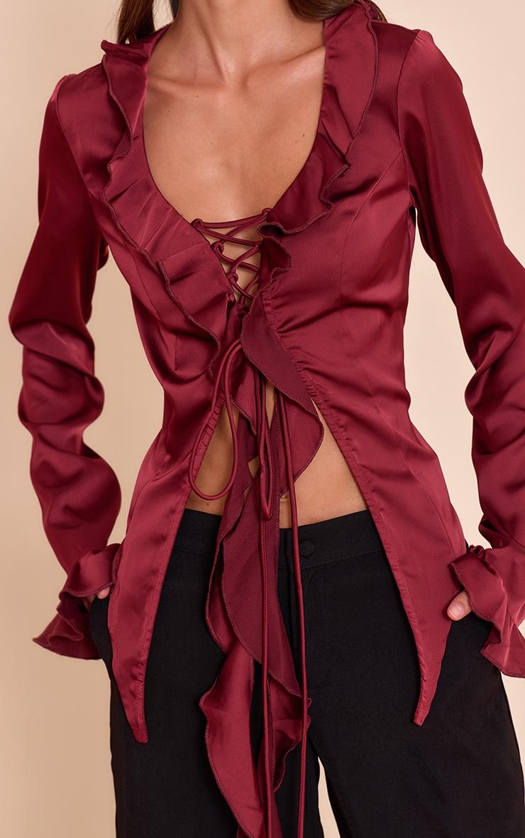 Keep it refined with the dark wine satin frill tie front long sleeve top. Made from a dark wine satin material, it features frill detailing, a tie front design, and long sleeves. Style with a pair of wide leg tailored pants, slip on mule heels and a clutch bag for an effortlessly chic look.Length approx 48.5cm/19inch (Based on sample size US 4)Model wears size UK 8/ EU 36/ AUS 8/ US 4Model Height - 5ft 7inchp]:!mb-4inch>Brand: PrettyLittleThingCategory: TopsProduct type: BlouseColor: Dark WineMaterial: SatinDesign: PlainNeckline: PlungeSleeves: LongOccasion: Evening