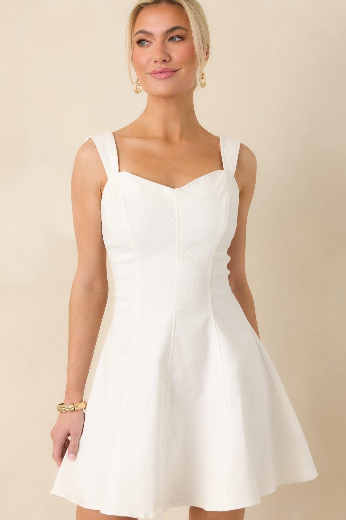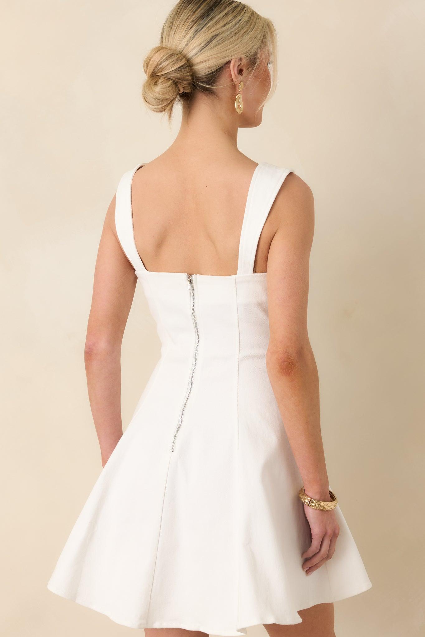 Effortlessly chic and undeniably versatile, this white cotton sleeveless denim mini dress is your go-to piece for warm-weather style. The crisp denim fabric offers structure and durability, while the sleeveless silhouette keeps you cool and comfortable. Perfect for layering with a jacket or wearing solo, this mini dress transitions seamlessly from casual daytime looks to evening outings. The timeless white wash pairs with everything in your wardrobe, making it an essential investment piece that works harder than you'd expect. This white dress features a silver hardware back zipper, a flattering fit and flare silhouette, a sleeveless design, and a paneled design that creates a more tailored look. 97% Cotton & 3% Spandex Unlined Hand Wash Cold Manufactured in China Designed in The USA Model is 5'6" and Wearing a Size Small, Clipped, Model is a True X-Small