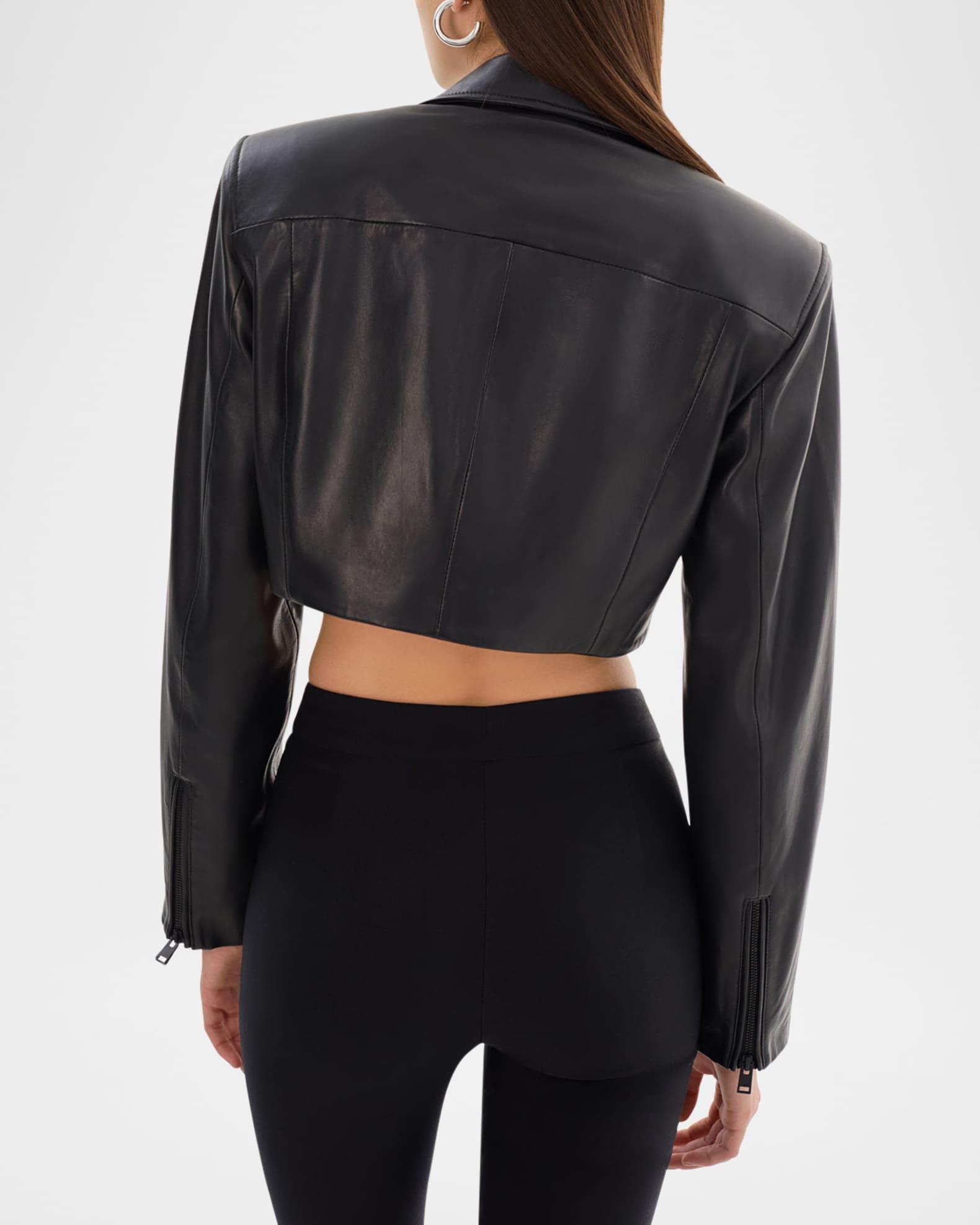 LaMarque "Daylin" sheepskin leather biker jacket Approx. 16.3"L from shoulder to hem Notched collar; asymmetric front zip Exaggerated shoulders Long sleeves with zip cuffs; approx. 33"L Yoked back Cropped hem Relaxed fit Leather Lining: Polyester/spandex Leather method dry cleaning Imported Proposition 65 warning for California residents Model is 5'10"/177cm.