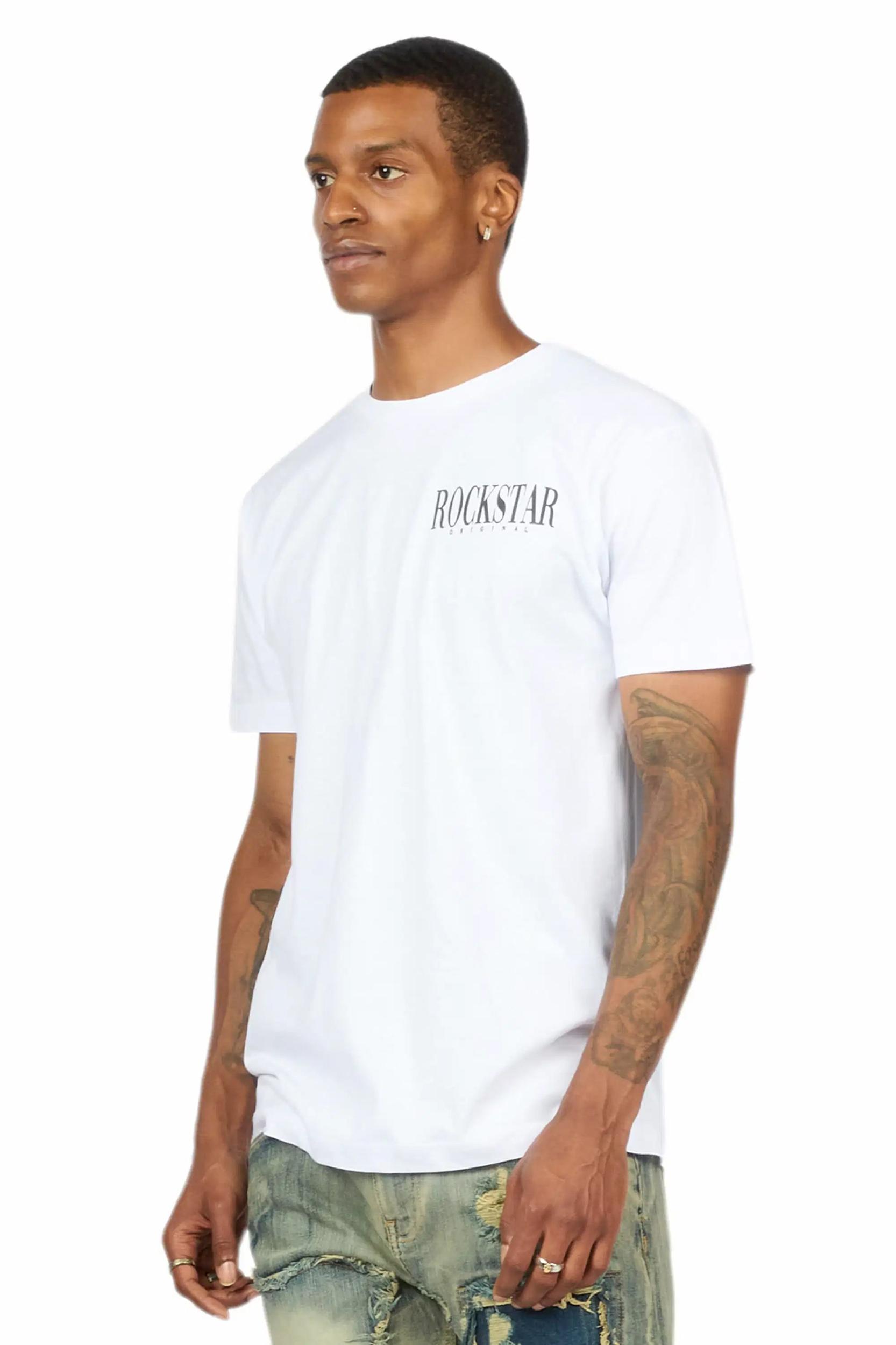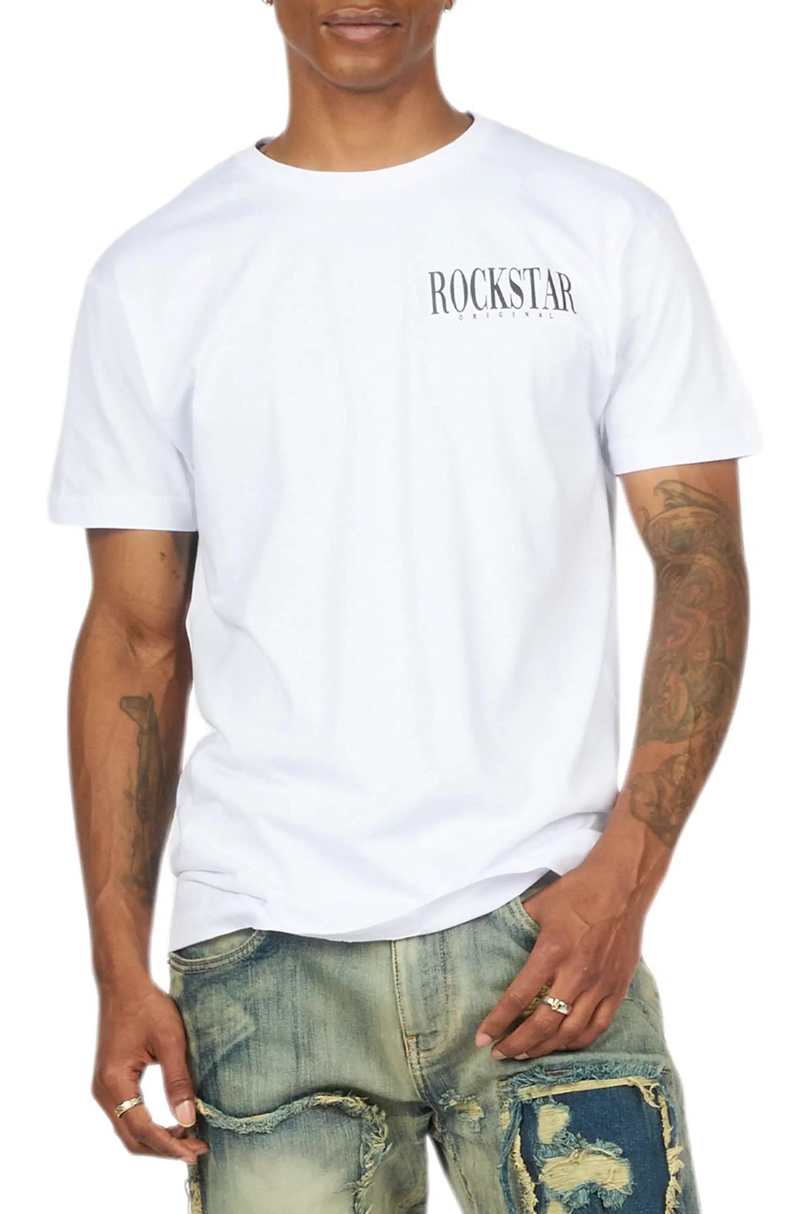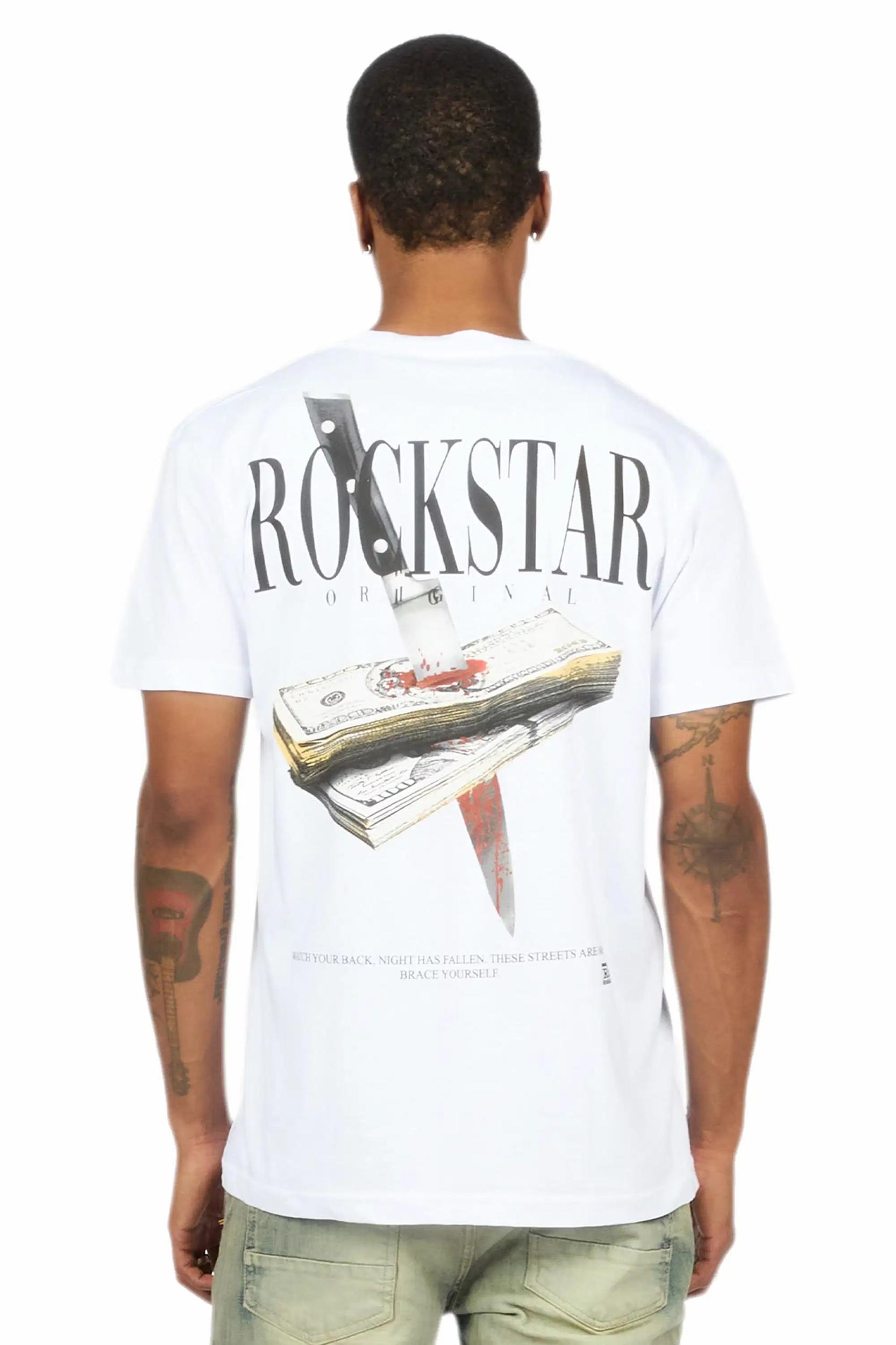 An urban streetwear t-shirt for men in white. Designed with ultra soft fabric and a custom money stack graphic for the perfect staple piece style. Crew neckline Short sleeves Pullover style Relaxed-fit Printed RSO logo Custom money and knife graphic