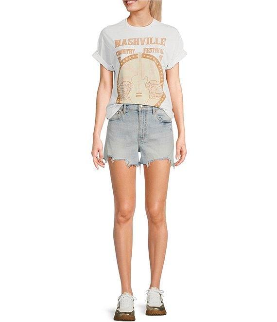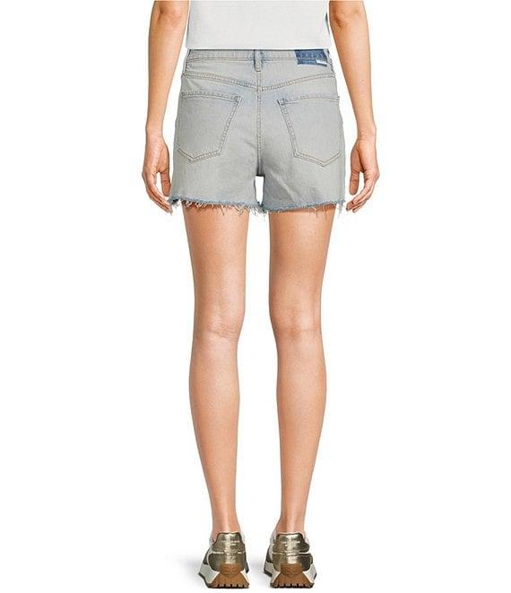 From Daze, these shorts feature: High rise 5-pocket styling Front button/zip Frayed distressed hem Short (3-5 inches) Cotton/spandex Machine wash/tumble dry Imported.