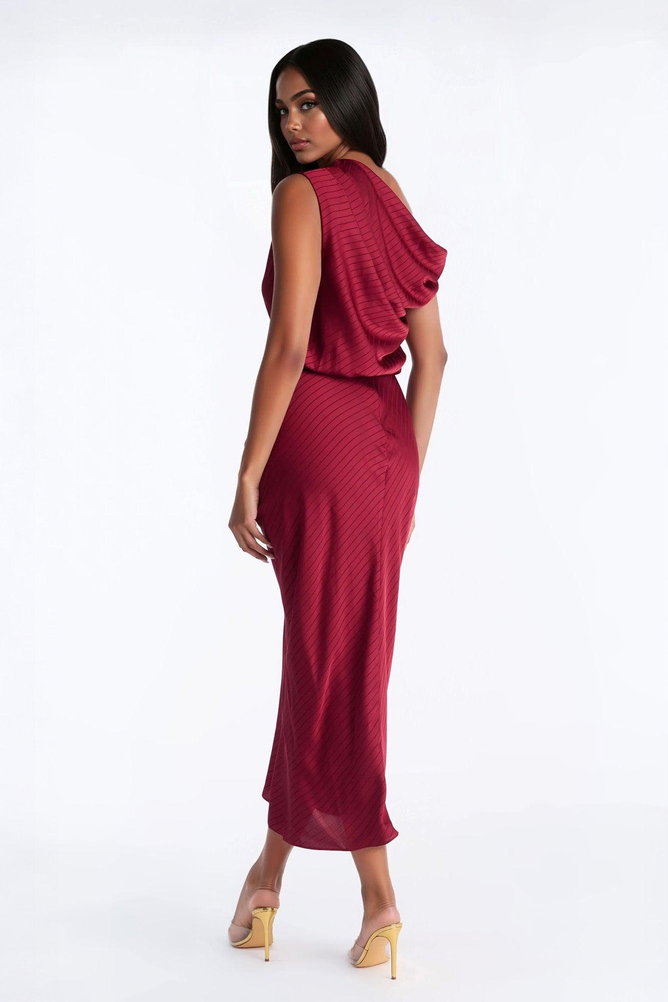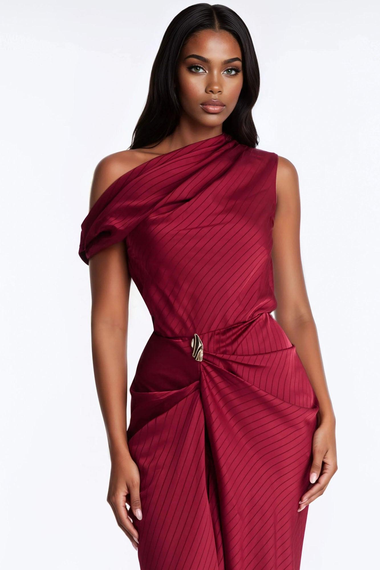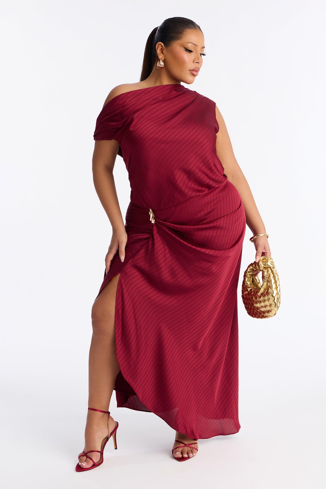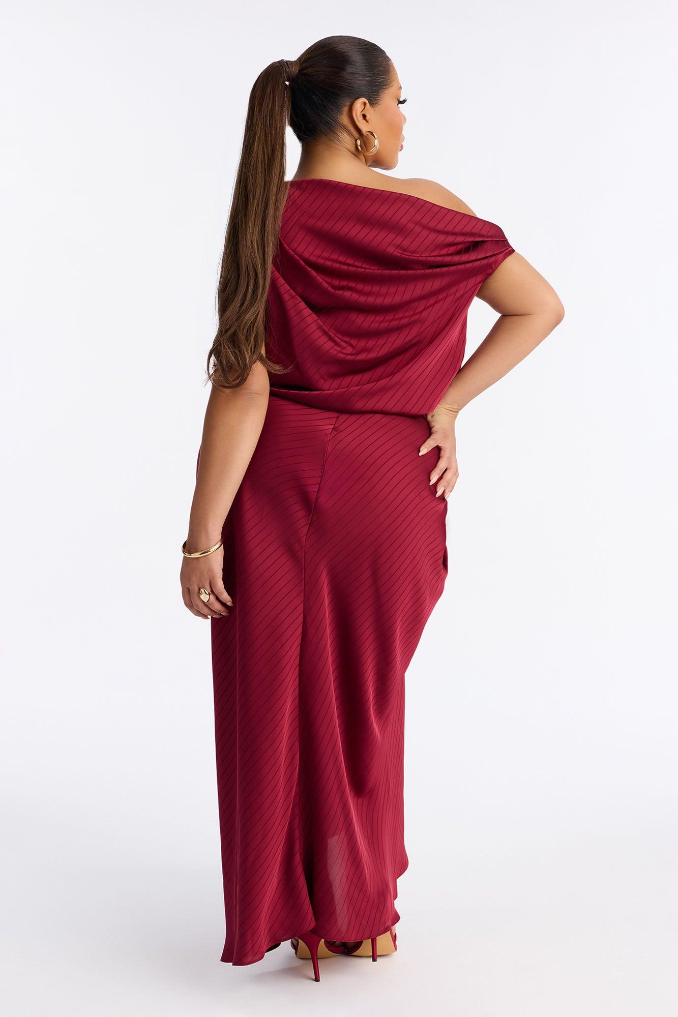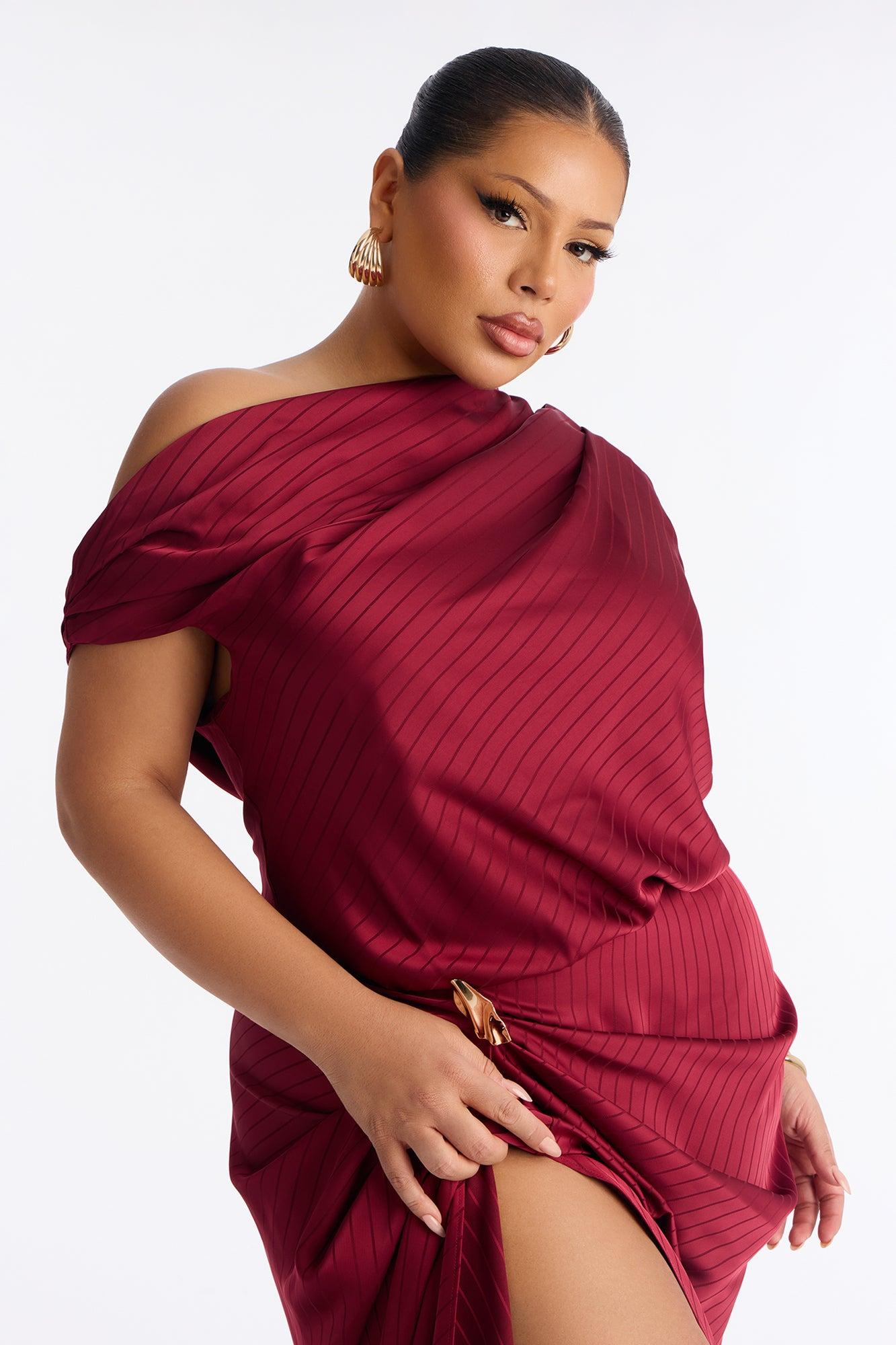 Available In Red. Striped Satin Maxi Dress Sleeveless Off Shoulder Neckline Hardware Slit Hidden Back Zipper Non Stretch Self: 97% Polyester 3% Spandex Imported California Proposition 65WARNING: Cancer and Reproductive Harm - www.P65Warnings.ca.gov.