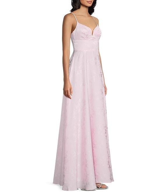 From Dear Moon, this dress features: Satin jacquard floral fabric V-neckline Sleeveless Adjustable spaghetti straps Gathers at the bust Long skirt with front slit Zip-back closure 63" length Polyester; lined Hand wash/line dry Imported.