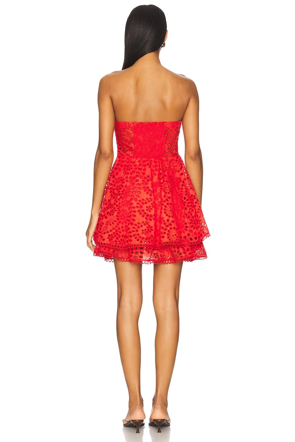 Self: 98% polyester, 2% cottonLining: 100% rayon. Dry clean only. Partially lined. Hidden back zip closure. Boned bodice. Tiered ruffle skirt. Midweight eyelet fabric. Neckline to hem measures approx 24" in length. Made in China. Revolve Style No. ASTR-WD752. Manufacturer Style No. ACDR102659S.