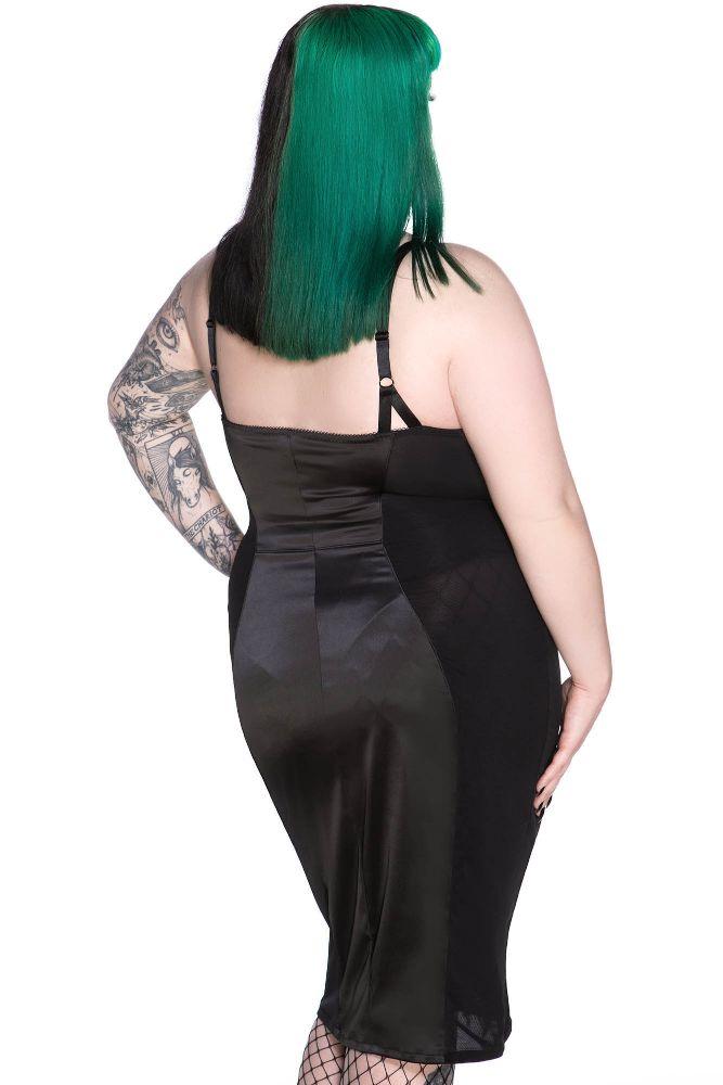DEE VILLE. Everything you want is on the other side of fear. - Super-Stretch Fabric.- Wide Straps.- Front Zip.- Spiderweb Detail.- Removable Pads.- Panel Accents.- Fitted. Channel some serious powerful vibes in our 'Dee Ville' midi dress; conjured using a super soft fabric which stretches to perfection for a body huggin' fit that will make them look twice! Complete with deadly details - seductive low neckline, front zip, spiderweb detail on bullet cups, and panel accents. You'll be ready to slay the night in this statement piece - purrfect for dark dates by the moon or decadent parties in yer castle! Looks killer with an oversized witch brim, yer fave statement heels, and a handbag! Wash Cold - Gentle Cycle. With KILLSTAR Branding, 95% Polyester, 5% Elastane.