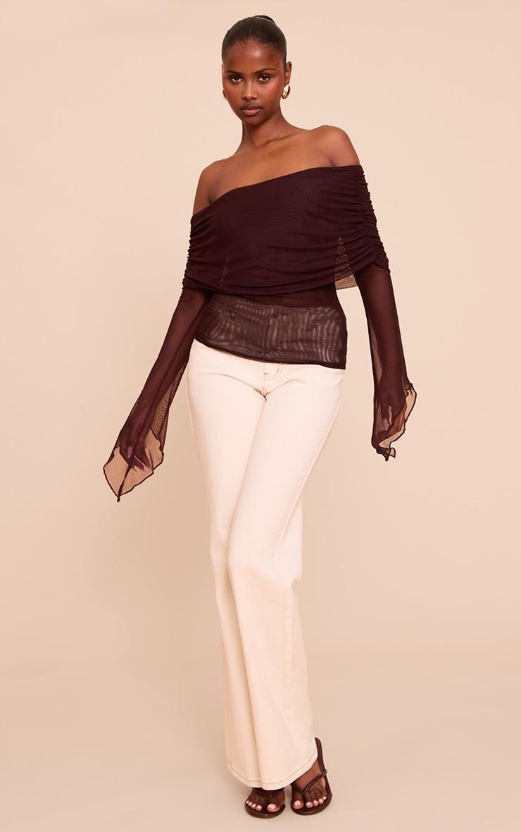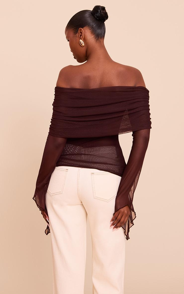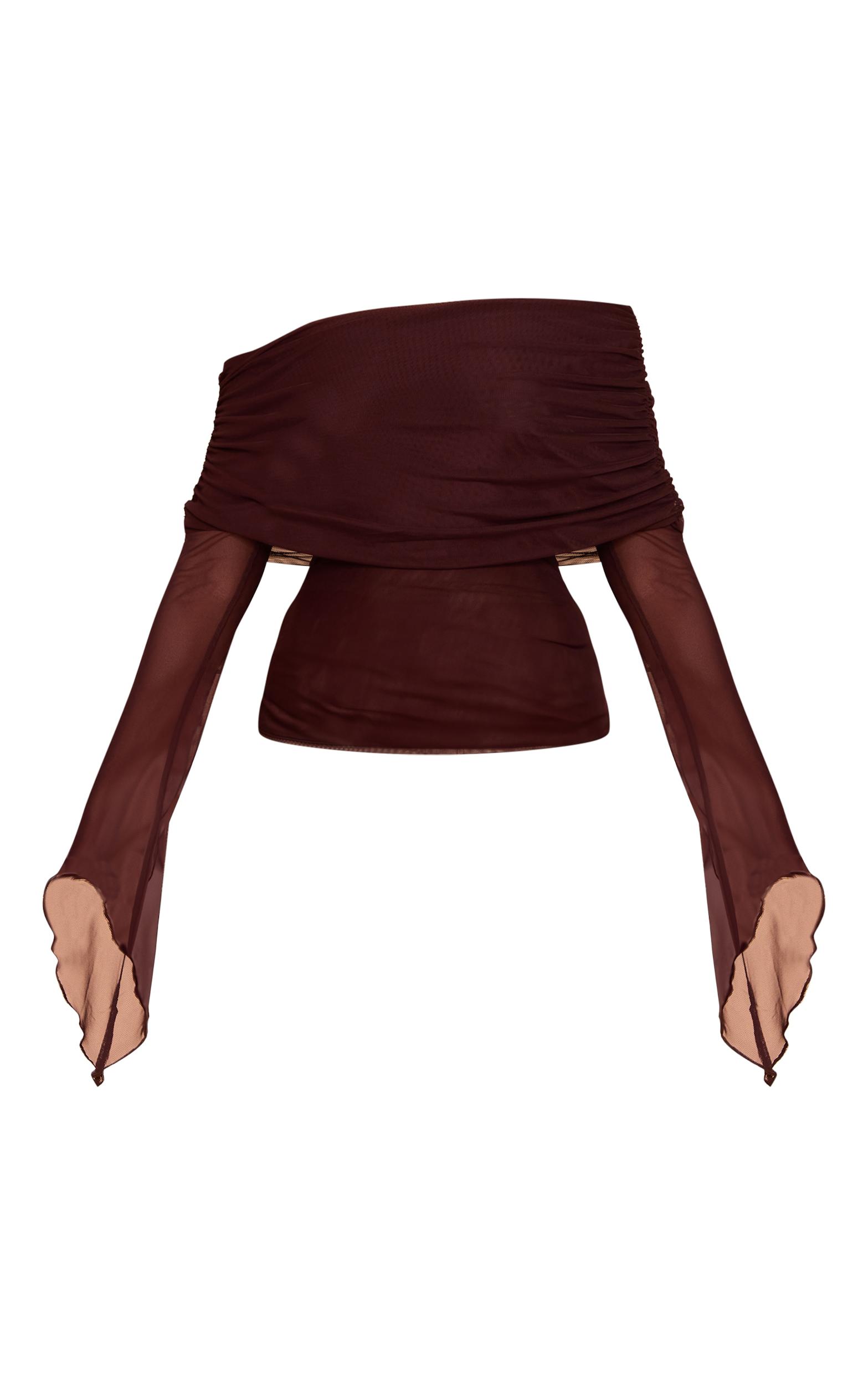 Level up your look in this deep chocolate mesh fold over extreme sleeve detail top. Tailored to perfection, this top is made from deep brown mesh with a foldover bandeau neckline and exaggerated flared sleeves. For effortless elegance, add this top to neutral toned pants and sleek kitten heels.Length approx 34.5cm/13.5inch (Based on sample size US 4)Model wears size UK 8/ EU 36/ AUS 8/ US 4Model Height - 5ft 9inchp]:!mb-4inch>Brand: PrettyLittleThingCategory: TopsProduct type: Bandeau TopColor: Deep ChocolateMaterial: MeshDesign: PlainNeckline: BardotSleeves: LongOccasion: Evening