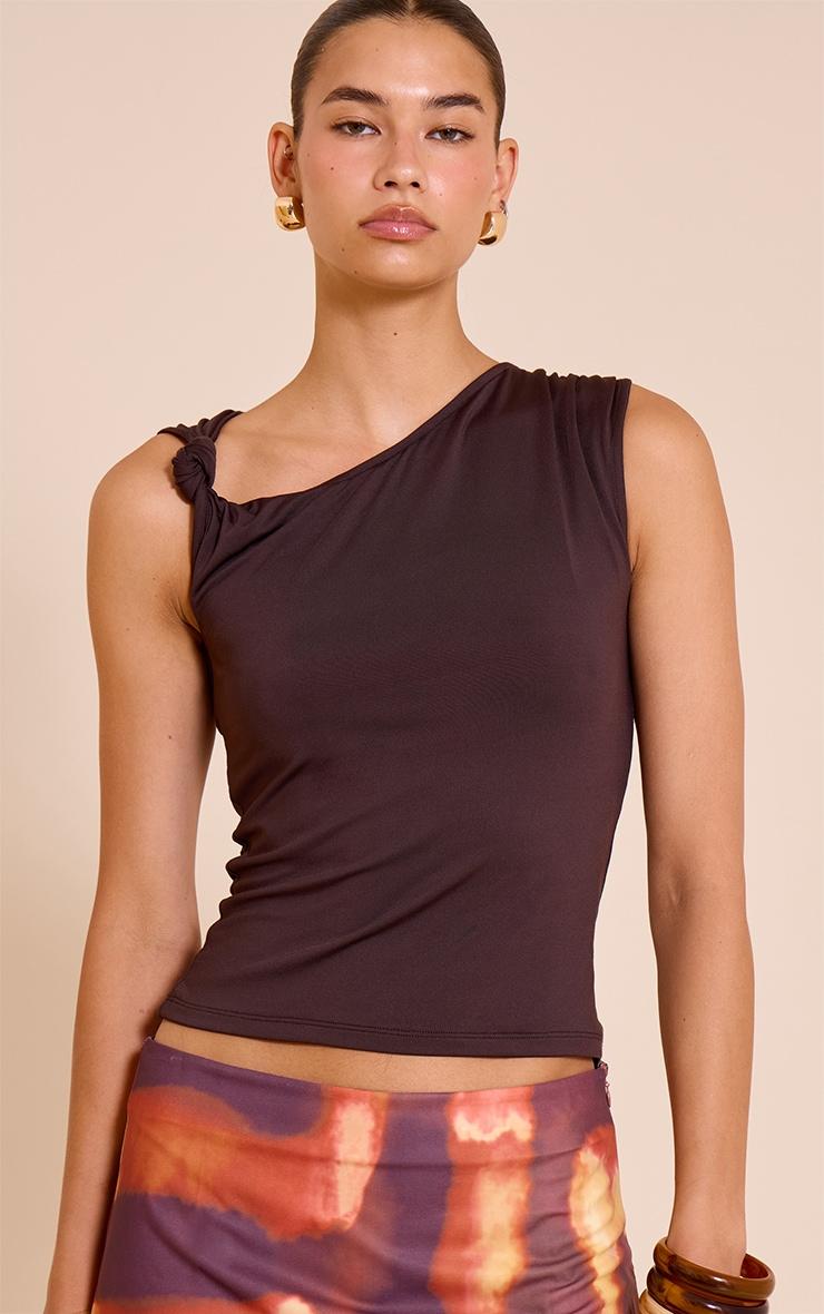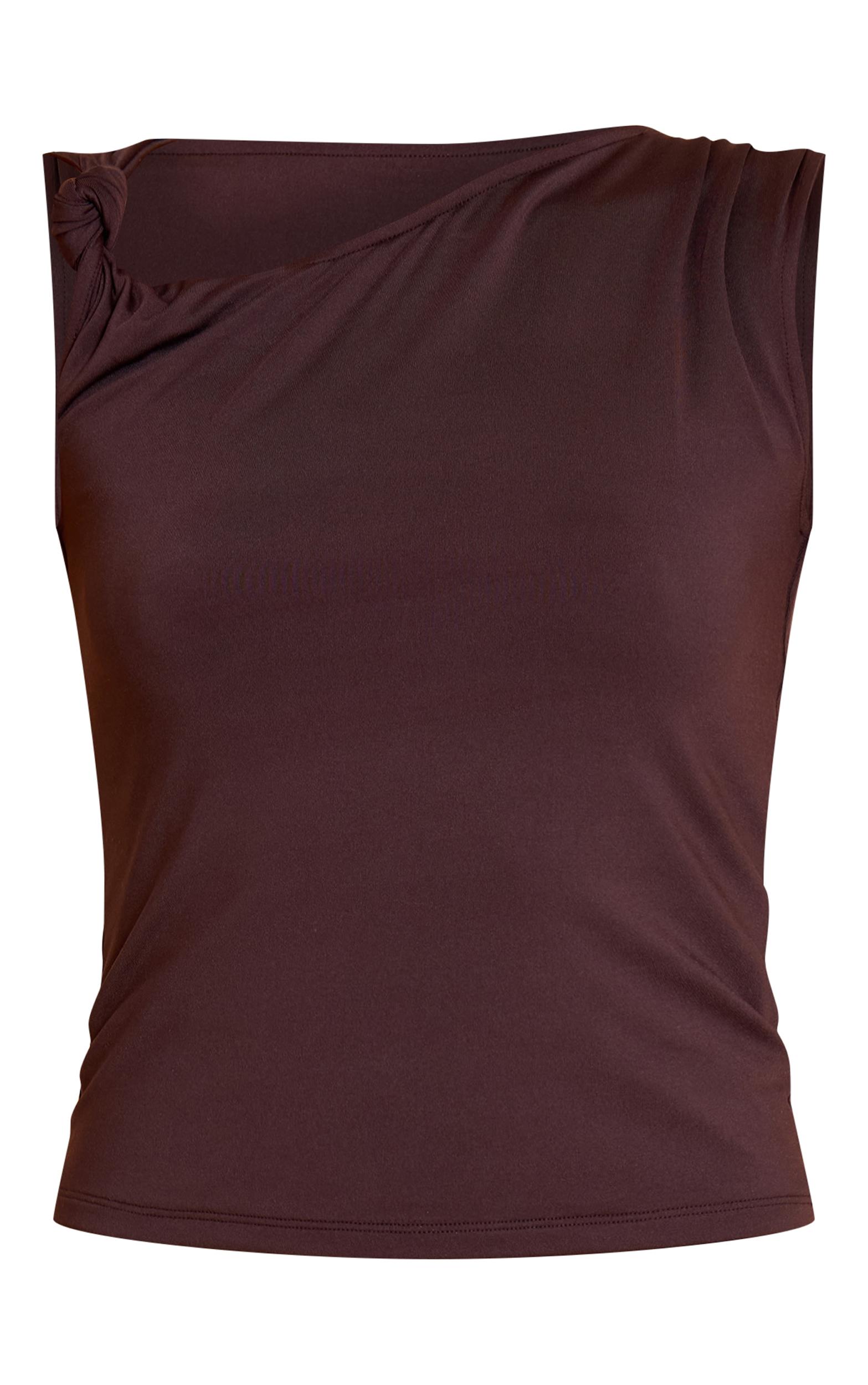 Feel your best in this deep chocolate slinky knot strap detail long top. Crafted from deep brown fabric, this top has an asymmetrical knot detail at the shoulder and a sleeveless design. Team it with a statement skirt, kitten heels and resin bangles for a tonal look.Length approx 48.5cm/19inch (Based on sample size US 4)Model wears size UK 8/ EU 36/ AUS 8/ US 4Model Height - 5ft 8inchp]:!mb-4inch>Brand: PrettyLittleThingCategory: TopsProduct type: Vest TopColor: Deep ChocolateMaterial: Single JerseyDesign: PlainNeckline: AsymmetricSleeves: SleevelessOccasion: Evening