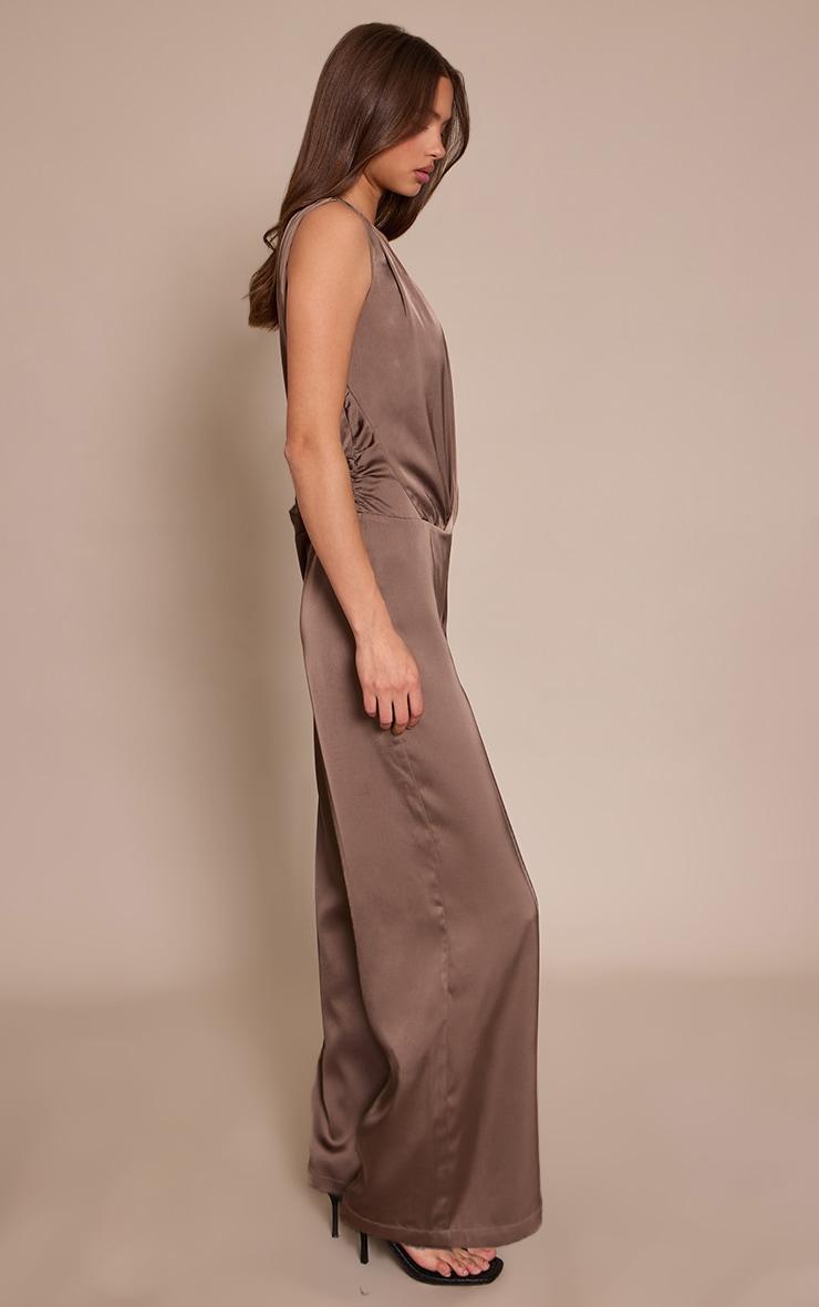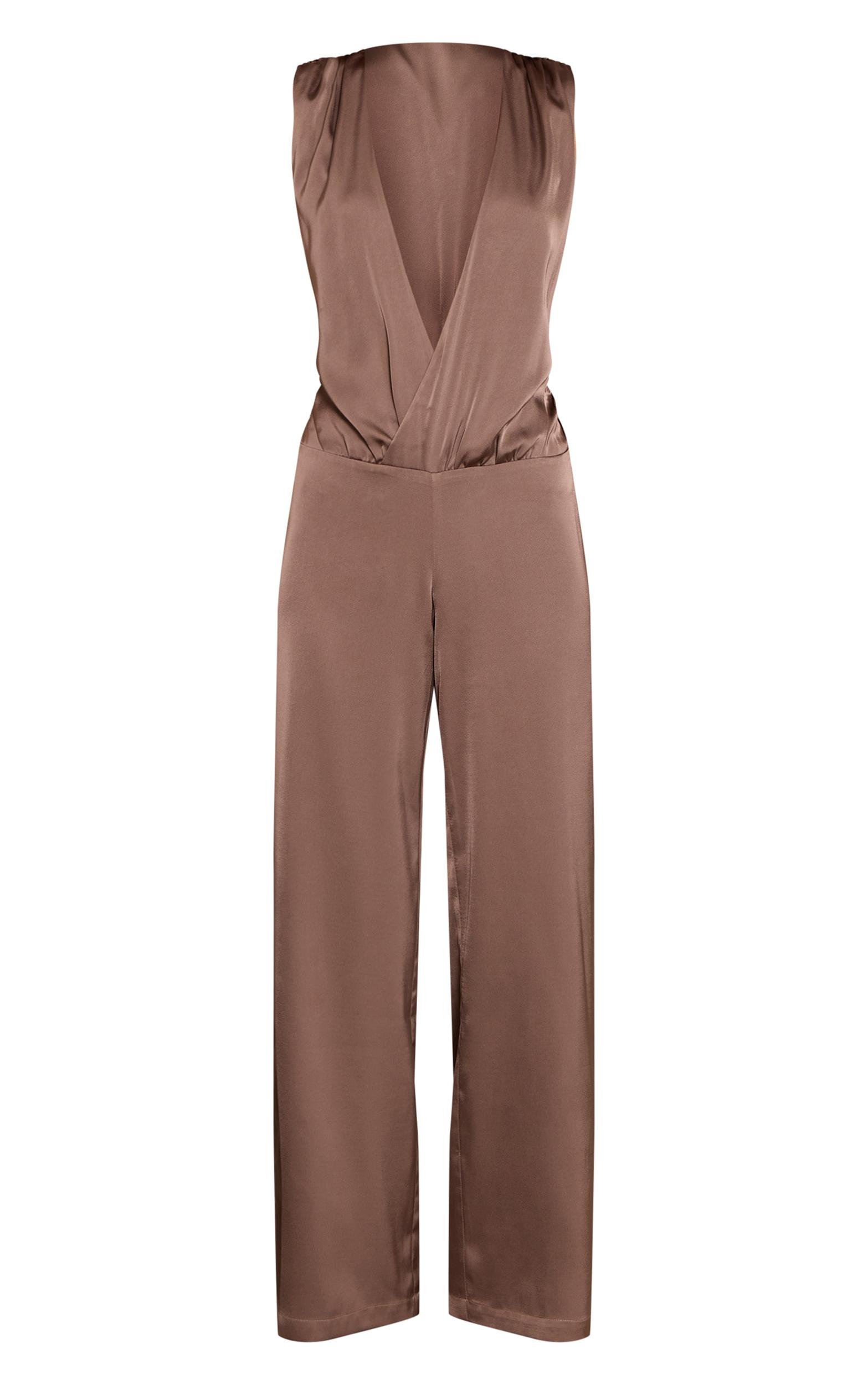Make an entrance that won't be forgotten with the deep taupe satin plunge dropped waist jumpsuit. Its bold plunge neckline, sleeveless cut, and wide-leg pants create a refined silhouette, perfectly balanced by the sophisticated dropped waist. Team this power piece with some sharp chunky heels and a sleek black bag for an unforgettable evening aesthetic. This look is tailored for the confident individual ready to own the night.Length approx 155cm/61inch (Based on sample size US 4)Model wears size UK 8/ EU 36/ AUS 8/ US 4Model Height - 5ft 9inchp]:!mb-4inch>Brand: PrettyLittleThingCategory: DressesProduct type: Wide Leg JumpsuitColor: Deep TaupeMaterial: SatinOccasion: Evening