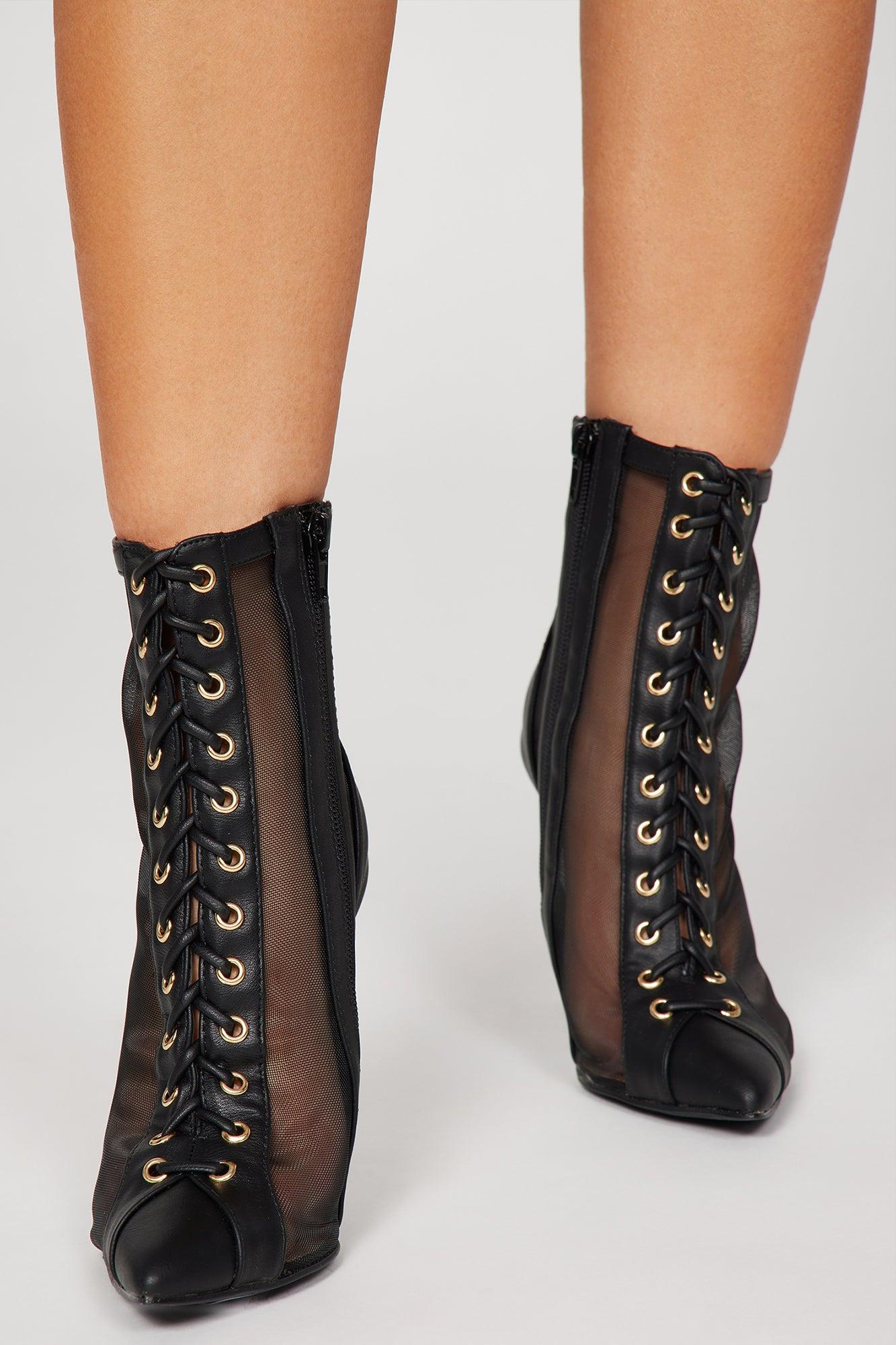 Available In Black. Lace Up Booties Zipper Detail Pointed Toe Ultra High Heel Imported