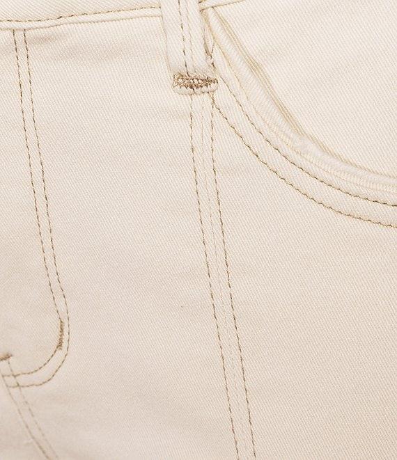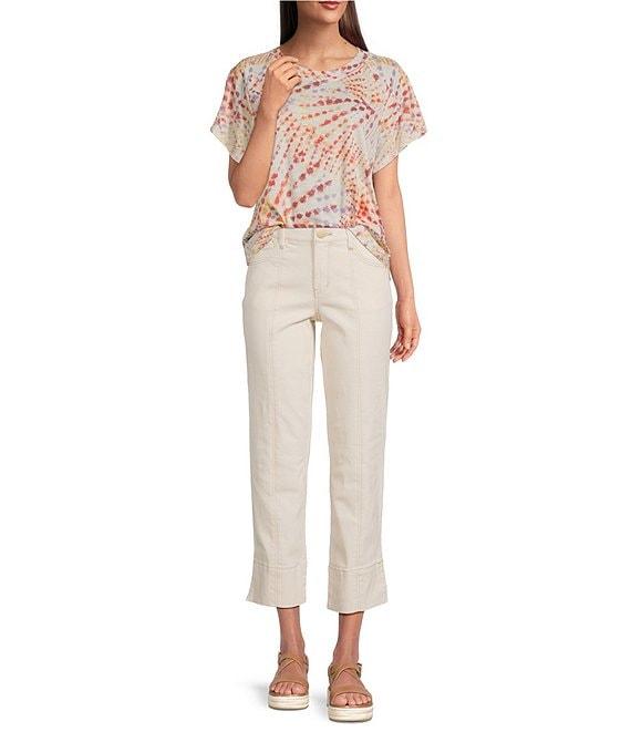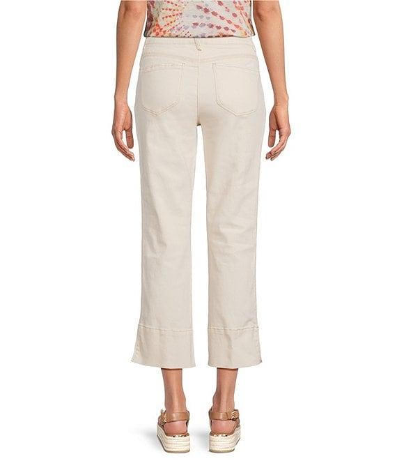 From Democracy, these pants feature: High-riseKick flare silhouette Belt loops5-pocket stylePintuck detail Crop length Straight hem with side slitsButton/zip fly closureApprox. 26.5" inseam; 16" leg opening; 10" front & back rise Cotton/spandexMachine wash/tumble dry Imported.