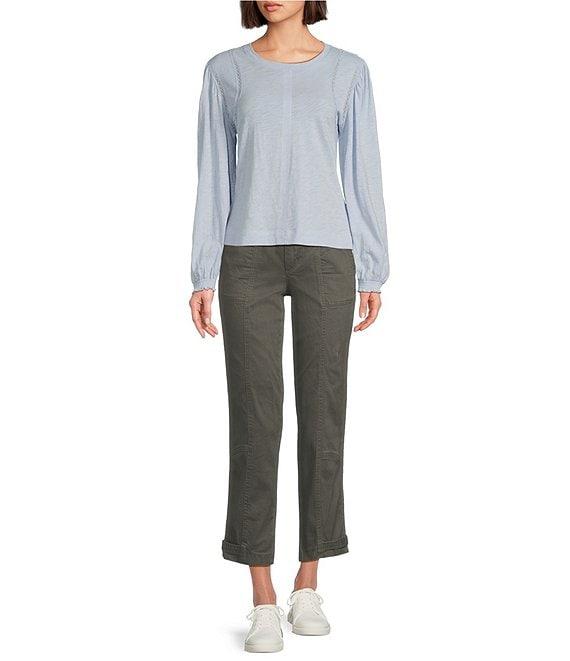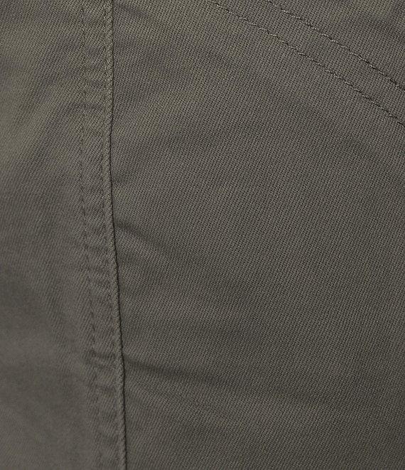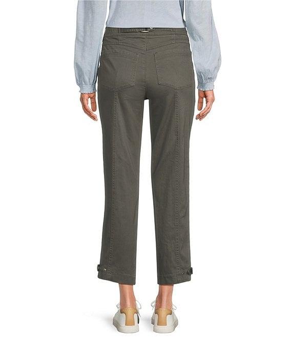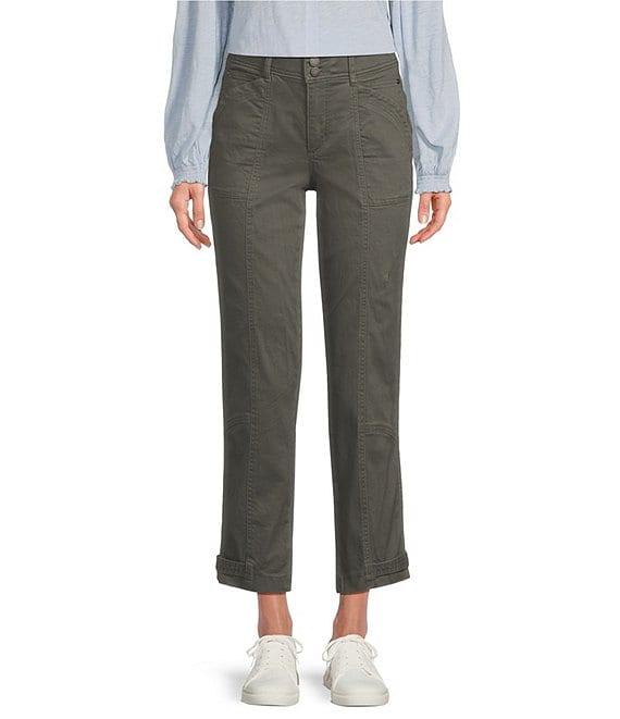 From Democracy, these pants feature: Stretch twill fabrication High-rise Straight leg Tapered utility style Belt loops Porkchop pockets Snap tab at hem Double button/zip closure Approx. 27" inseam, 10" front & back rise, 14" leg opening Cotton/spandex Machine wash/tumble dry Imported.