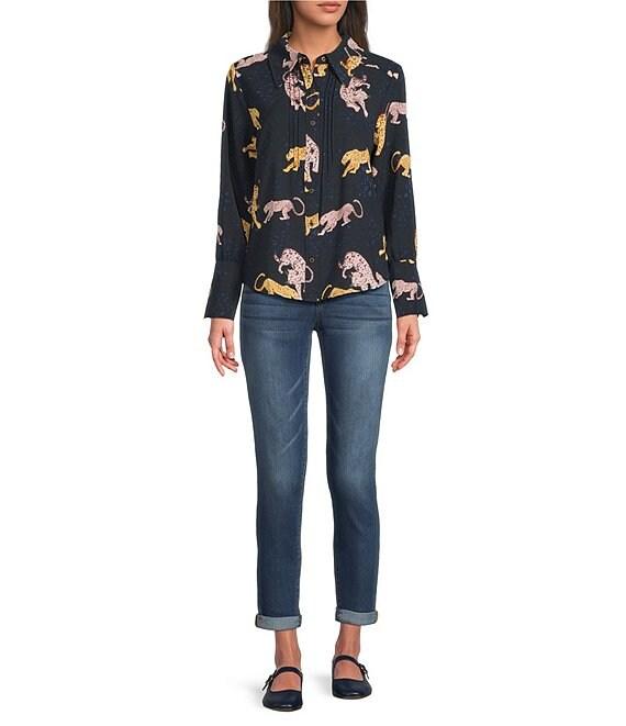 Democracy Petite Size Woven Animal Print Point Collar Long Sleeve Button-Front Shirt