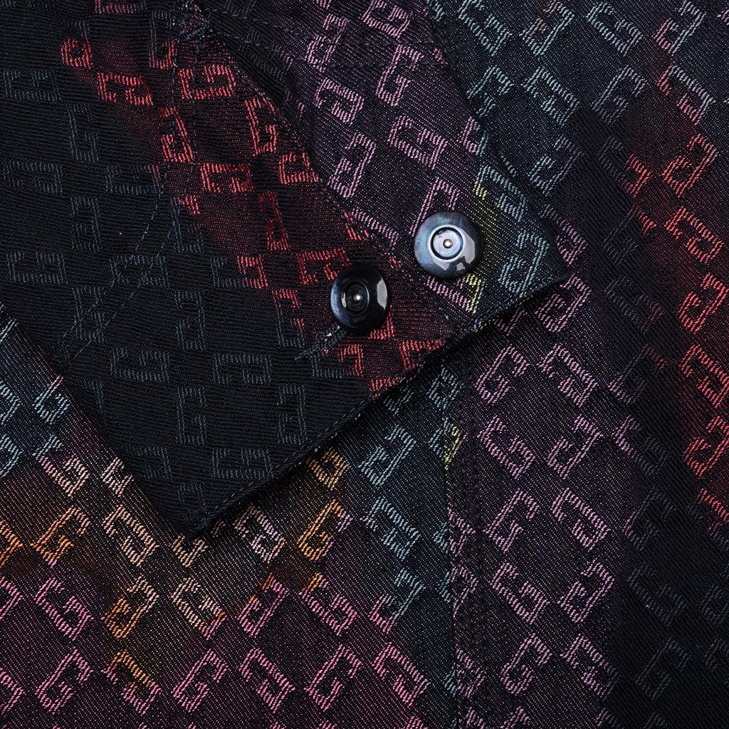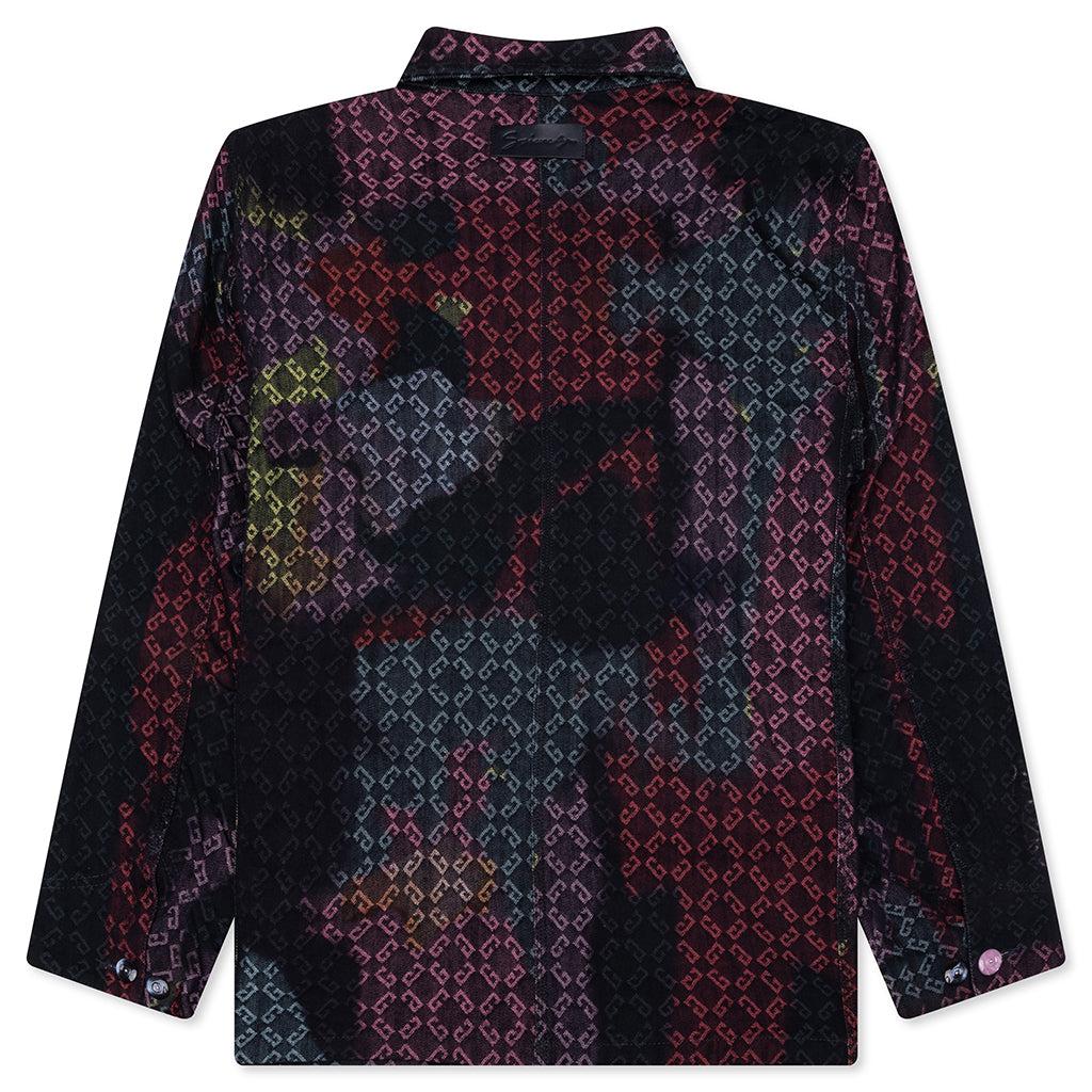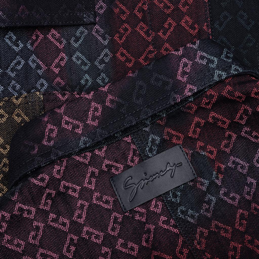 The Denim Monogram 72 Workwear Jacket from GIVENCHY showcases the brand's inventive take on its signature Monogram 72 motif—rendered in vibrant hues through a Tomo Campbell jacquard woven design. Crafted from a cotton-poly blend, it features a classic collar, front button closure, buttoned cuffs and two chest and two front pockets. A stitched leather 'GIVENCHY' patch sits at the upper back and completes the ensemble. 60% Cotton, 40% Polyester Monogram 72 jacquard by Tomo Campbell Classic collar Front button closure Two chest pockets Two front pockets Buttoned cuffs 'GIVENCHY' leather patch on upper back Style No: BM01BJ515Z-960