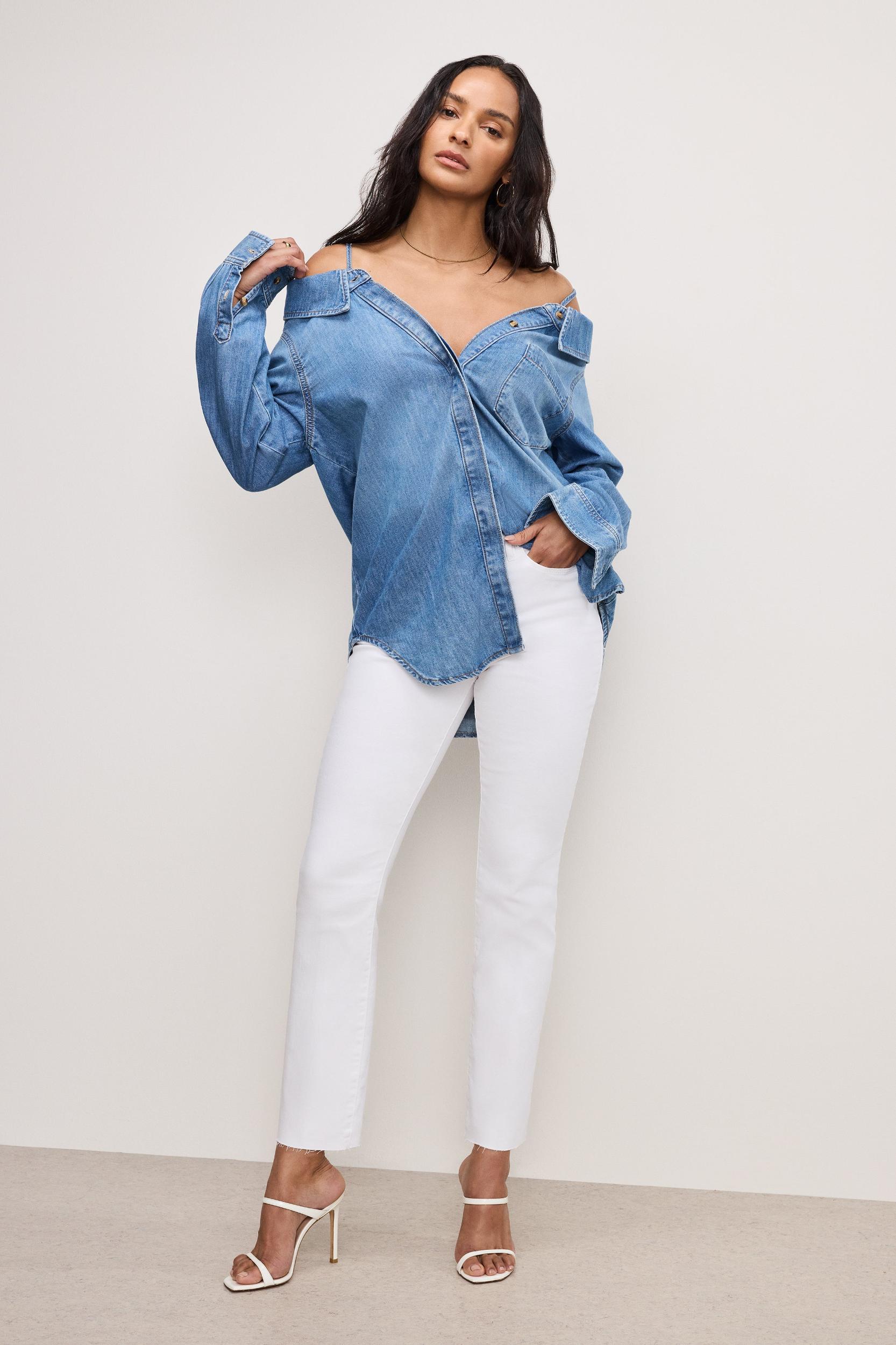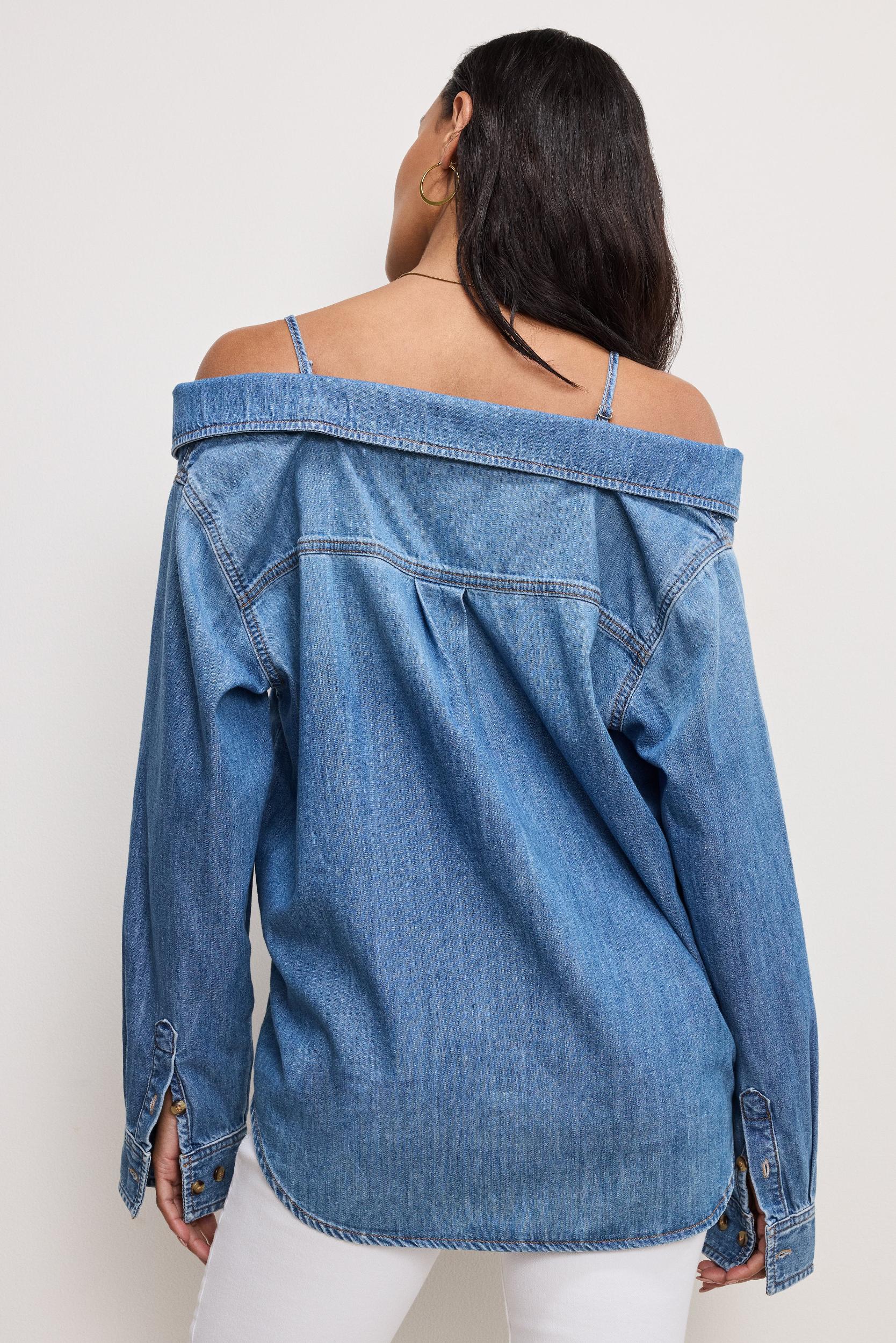 Our Denim Off-Shoulder Shirt gives a classic fabric a fresh, flirty twist. Effortlessly cool and undeniably chic, it’s made for turning heads. Off-the-shoulder neckline Long sleeves