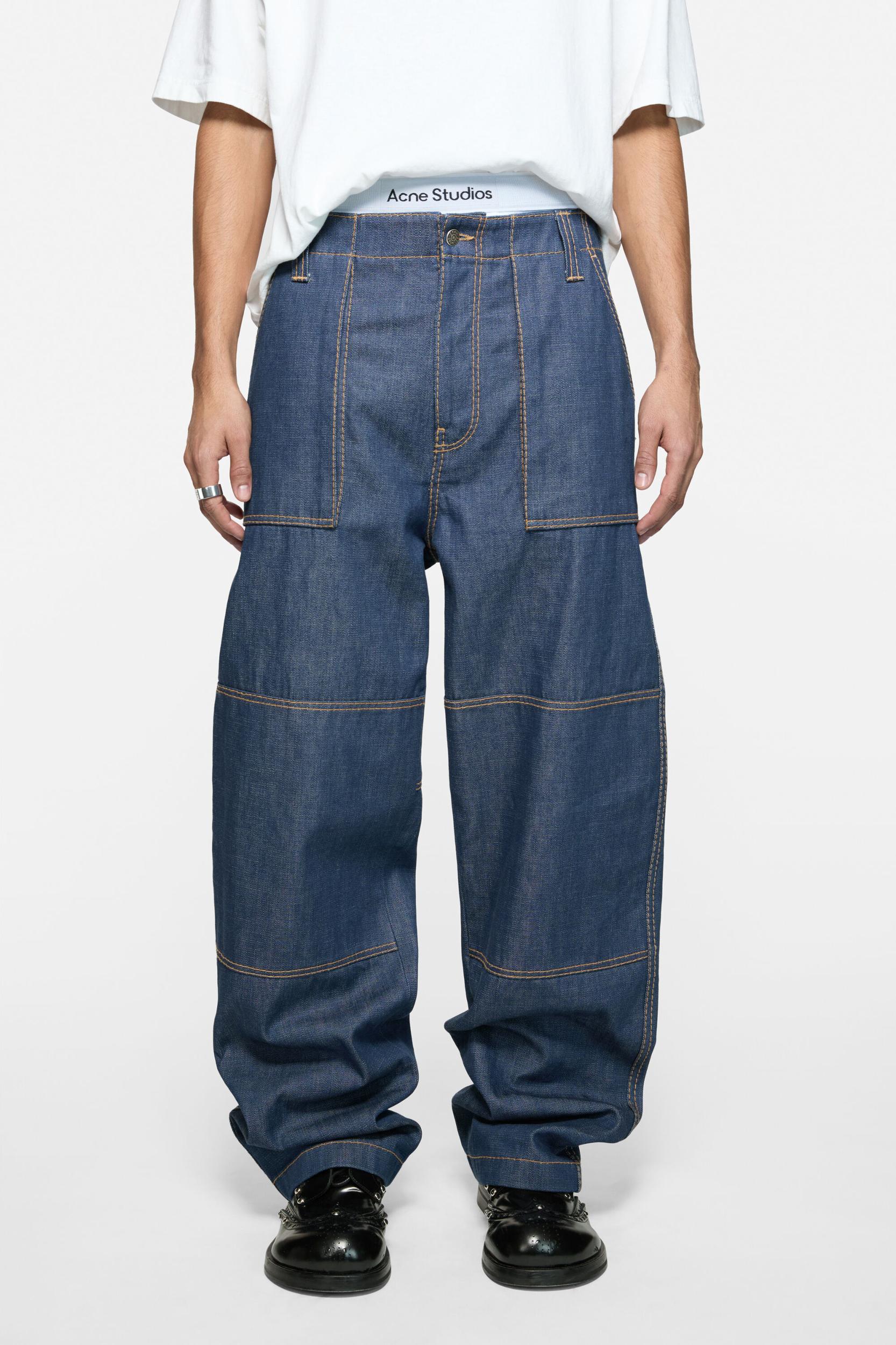 Trousers crafted from Japanese indigo twill denim, featuring knee patches with contrast stitching and a back waist cinch with buckle closure. Complete with side and back pockets, a back panel with contrast stitching, and a leather logo label on the back pocket. Cut to a regular fit with a mid waist. FN-MN-TROU001137