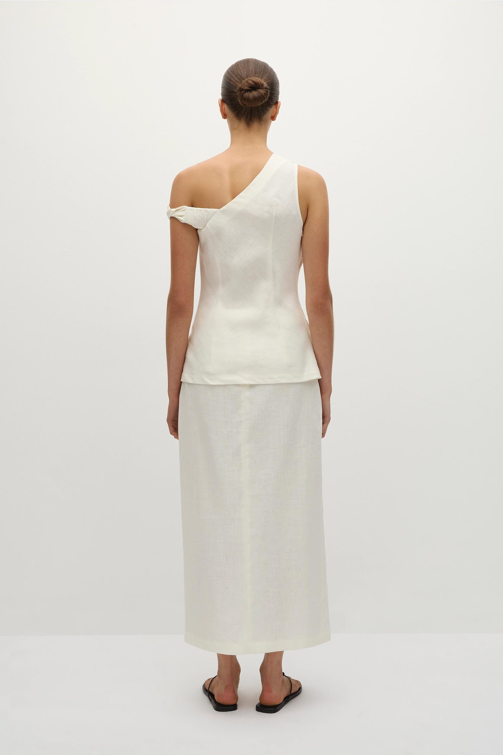 A midi dress with a deep V-neckline and wide straps that sit up on the shoulders. Designed from a delicate cotton voile in a warm white, it features vintage-inspired lace detailing around the neckline, under the bust and around the hem. There are back waist ties which allow for custom cinching and the skirt flares out in a soft A-line, cropping above the ankles. Style with a simple sandal for elevated everyday dressing.This style is true to size. The back ties are adjustable for custom fit through the bodice. Wear over neutral intimates.