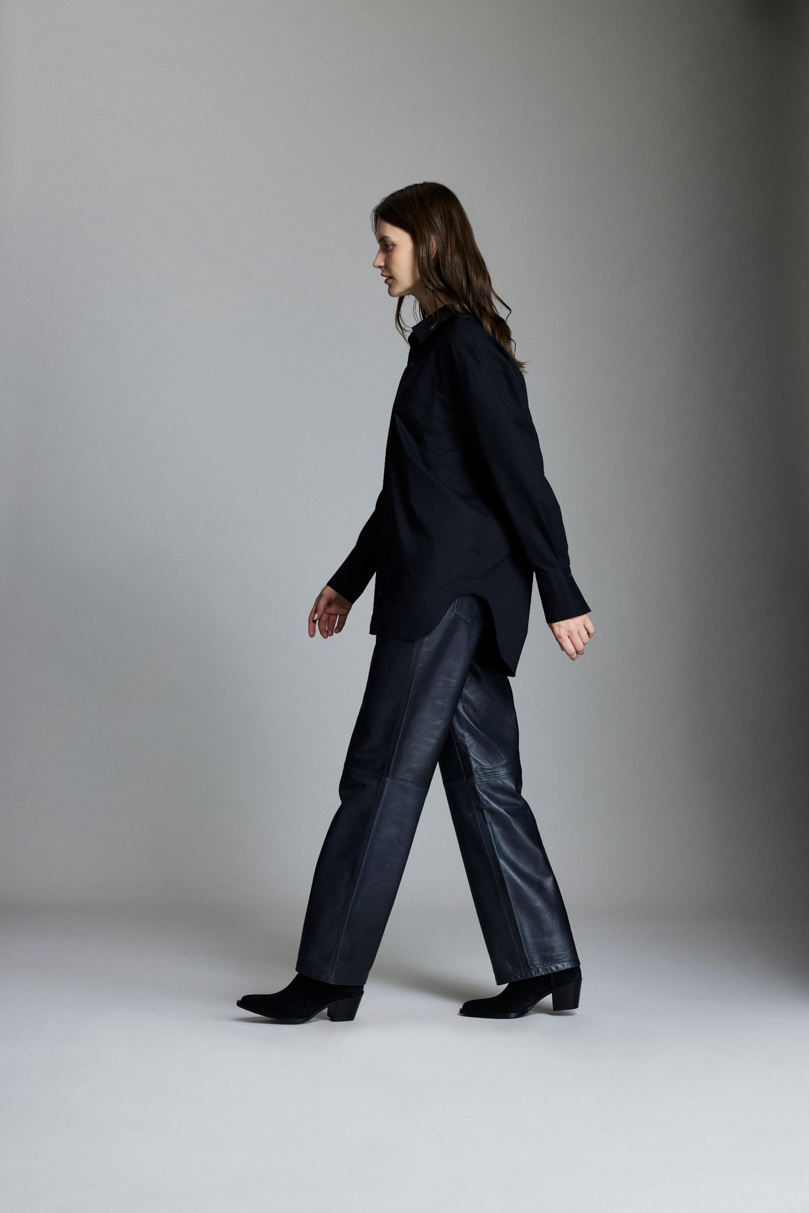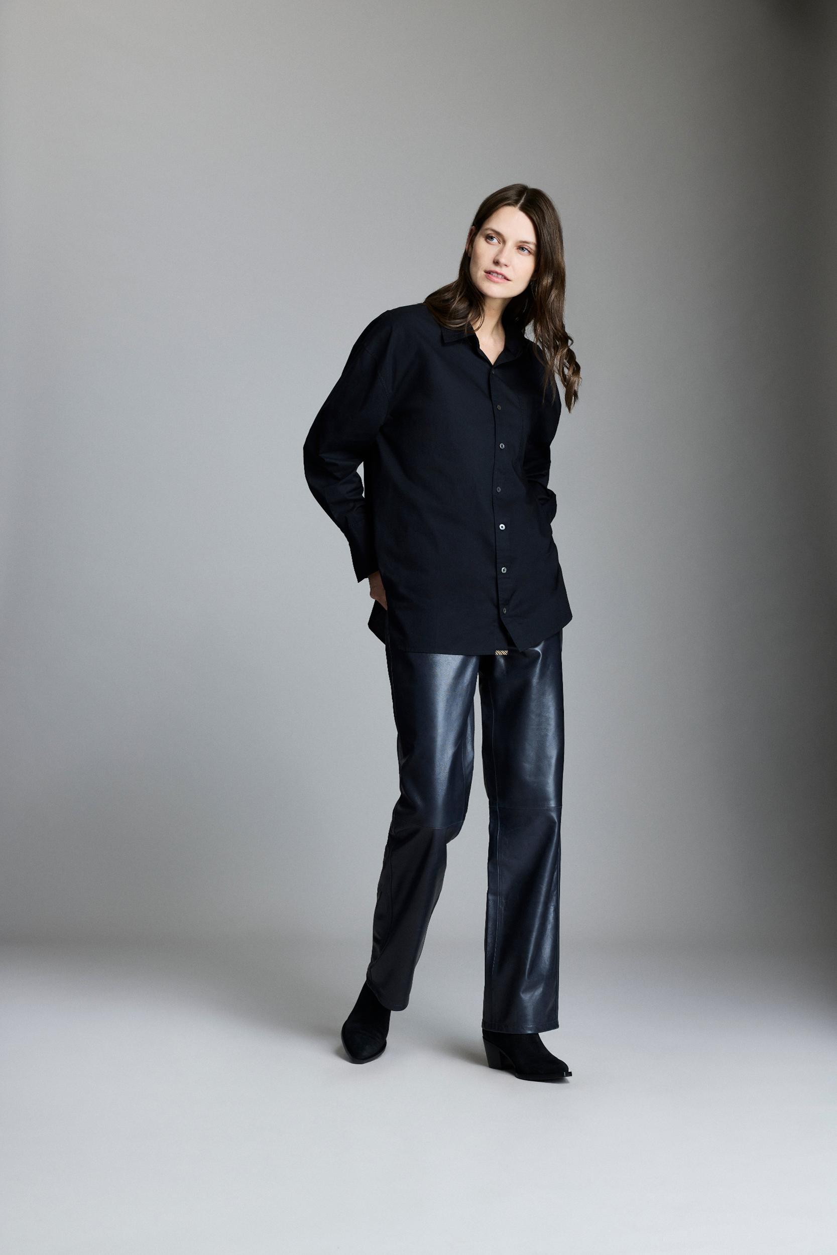Cut with long dolman sleeves and a detachable collar, this top makes a casually elegant choice for the season. Made with a cotton poplin in a relaxed fit, and finished with thoughtful touches like smoke trochus buttons throughout. Wear it with jeans or with a tailored pant, or just loose over our suede legging for chil