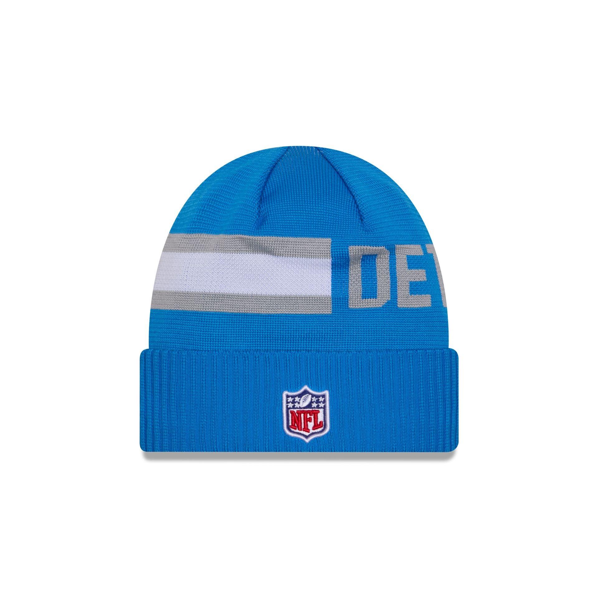 The Detroit Lions 2024 Cold Weather Tech Knit Beanie features an embroidered Lions logo at the front cuff with a matching NFL Shield at the rear. Additional details include a team wordmark at the right crown and a stripe at the left.