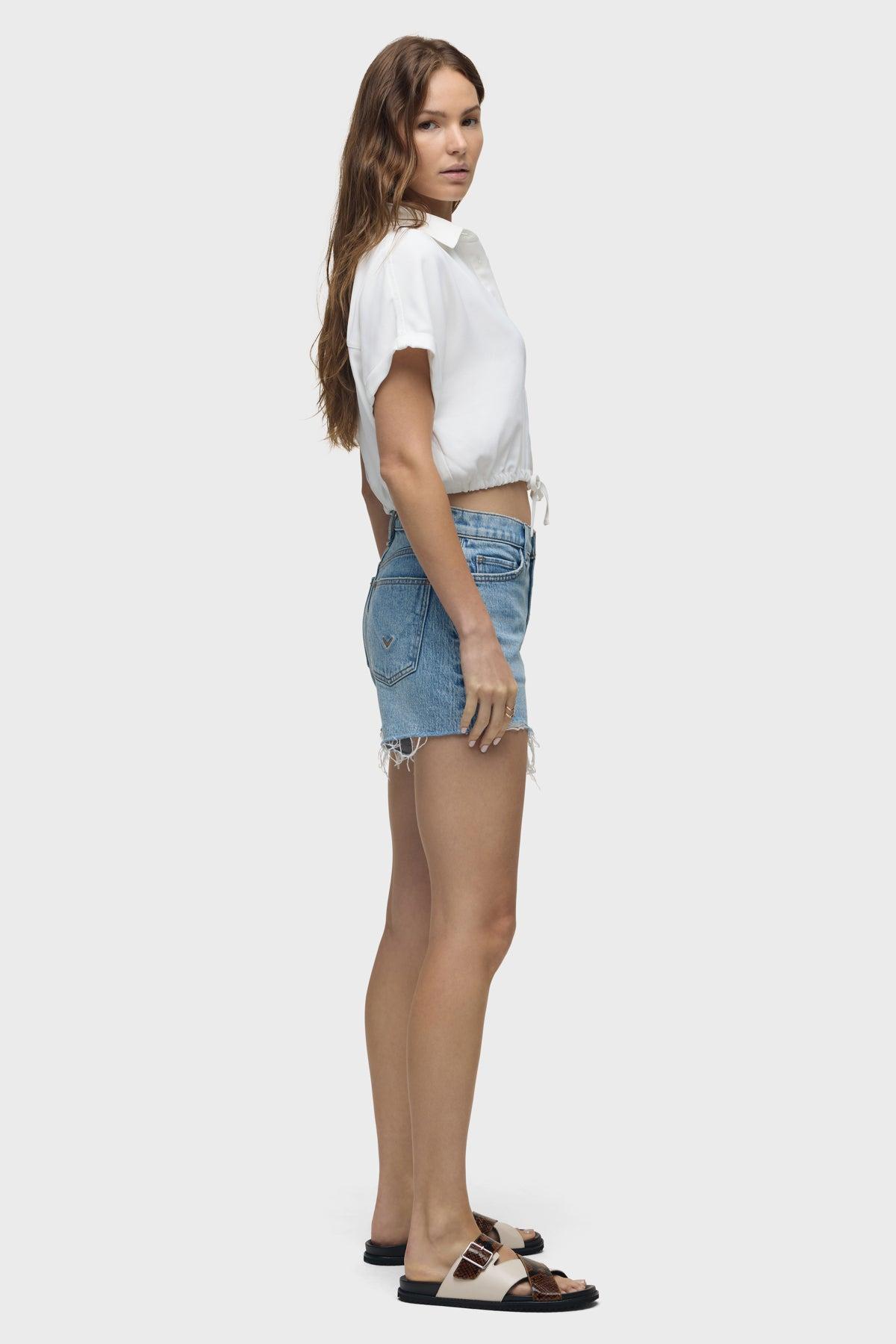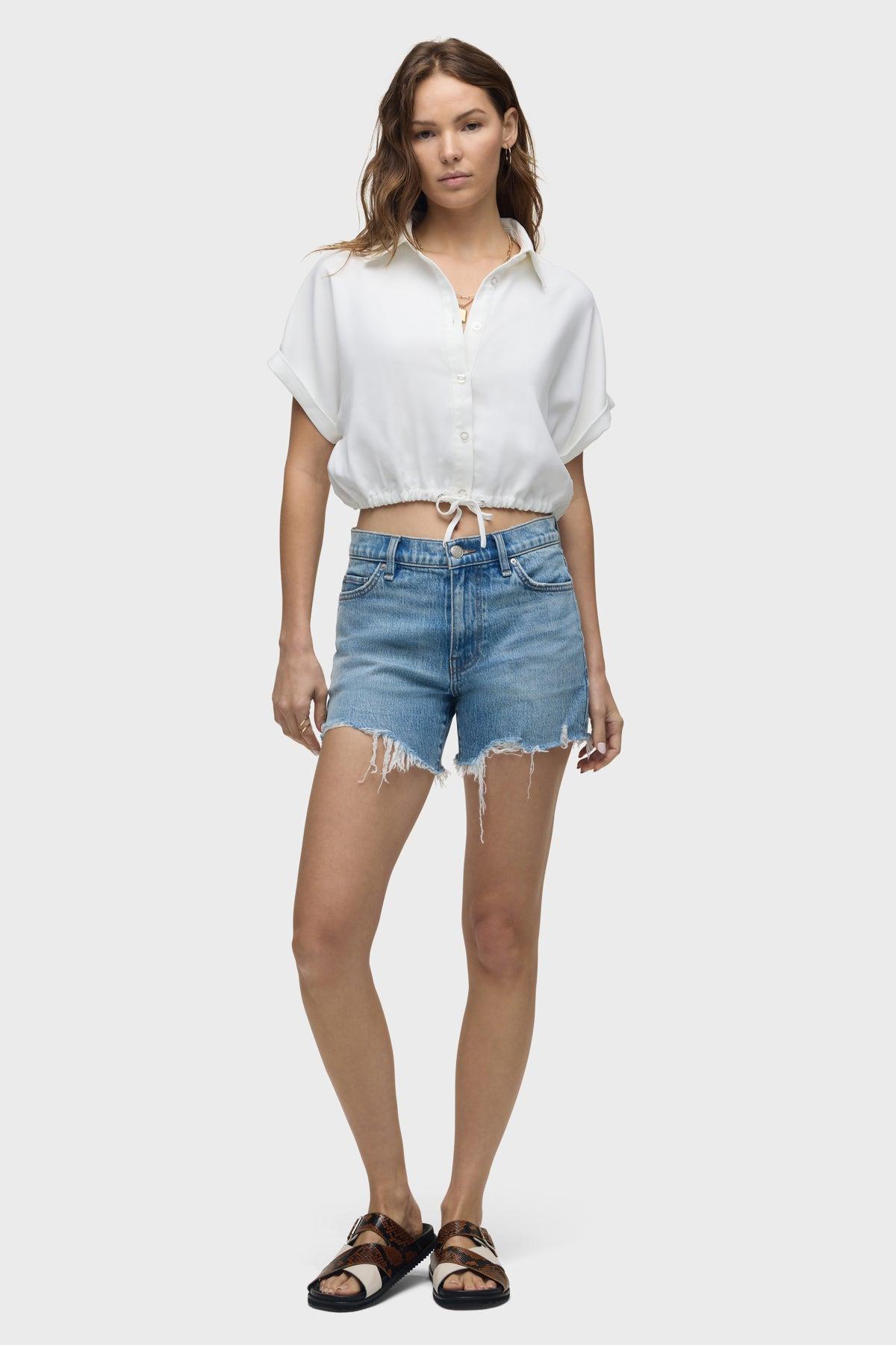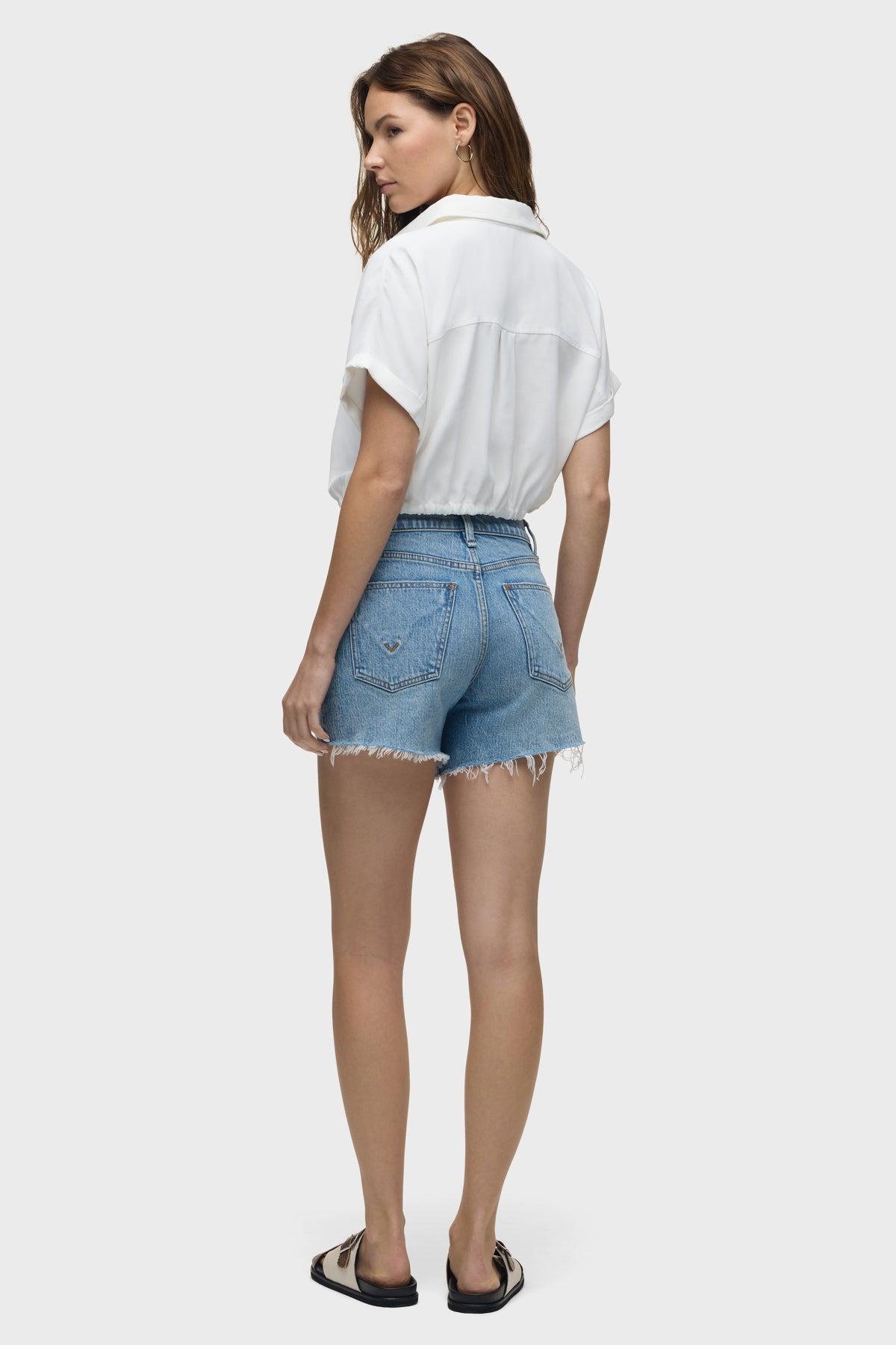 Description The Devon Boyfriend Short in Anthem has a relaxed boyfriend fit with a cool destructed hem. This pair is made of a premium comfort stretch denim in a vintage-inspired medium indigo wash with heavy stone washing, bleaching and edge grinding. Product Details Front Rise: 11", Leg Opening: 23.5", Inseam: 5"Model Height 5'9"Model wearing size 25Measurements based on size 27 Fit & Care Content: 99% Cotton, 1% ElastaneMachine wash cold with like colorsDo not bleachTumble dry low or hang to dry