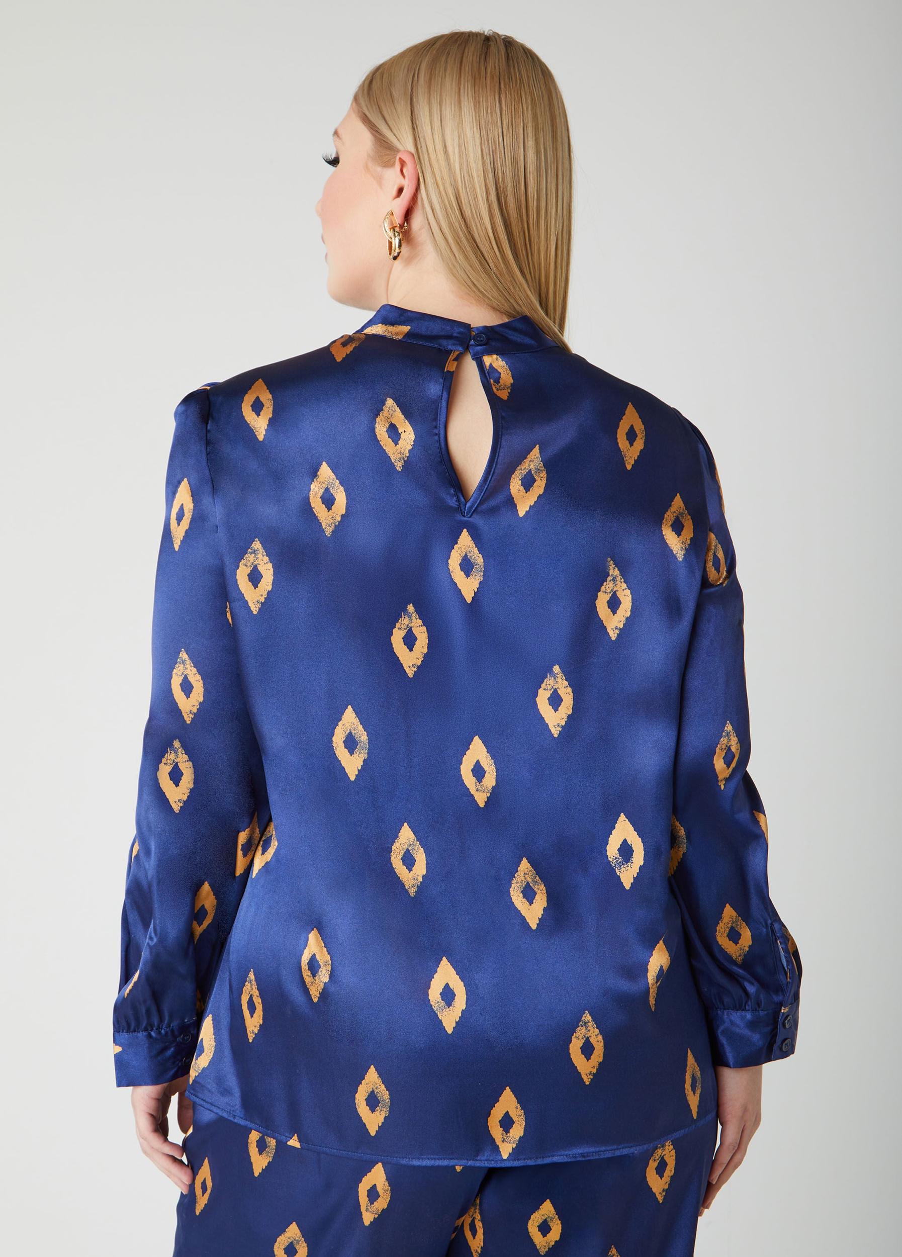 This diamond-print satin blouse isn’t here to blend in. Featuring a sleek mock neckline and a bold pattern, it brings all the style and attitude you need to command attention. Can be worn as a two-piece set with matching pants for a statement-making look.