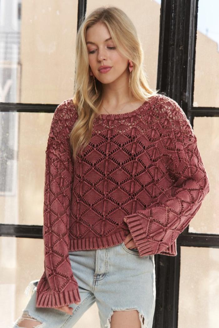 This sweater features: * Long sleeve * Diamond pattern * Knit sweater *Textured *Crochet fabric mix * Crewneck *Casual oversized fit