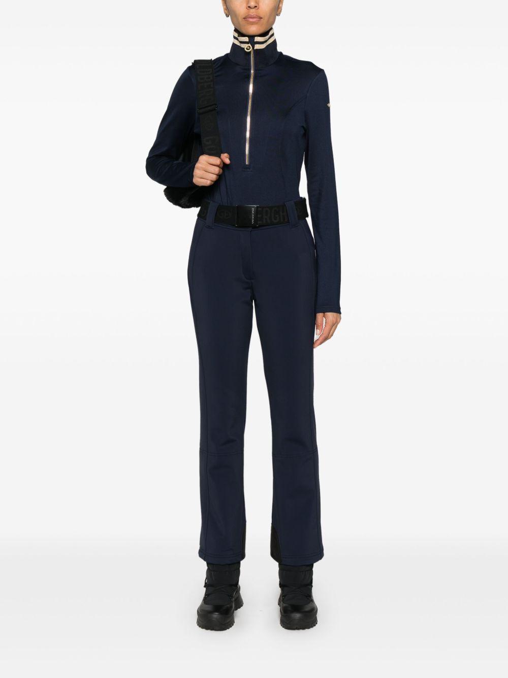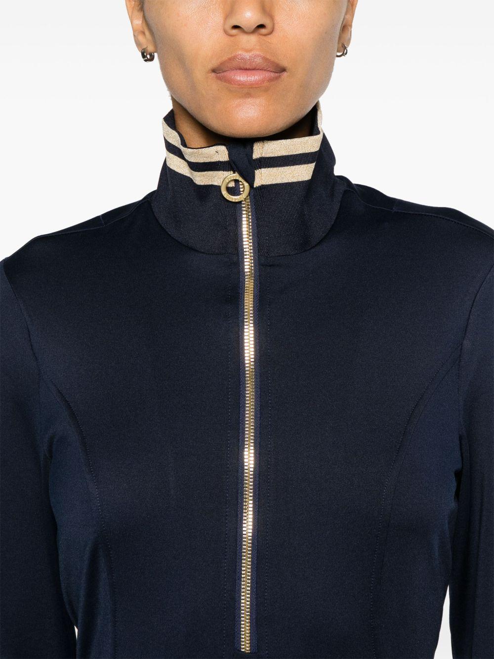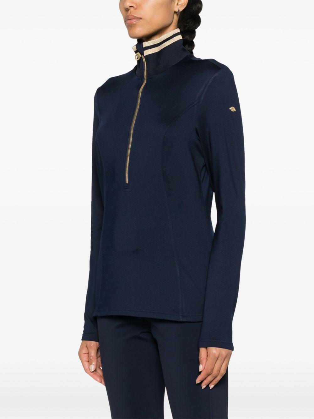 Goldbergh Diane ski pully | Blue | navy blue/gold-tone | stretch-jersey | gold-tone logo plaque | lurex stripe trim | high neck | short front zip fastening | long sleeves | straight hem | fleece lining | Polyester/Elastane | Ski Tops | Skiwear | Activewear | Women