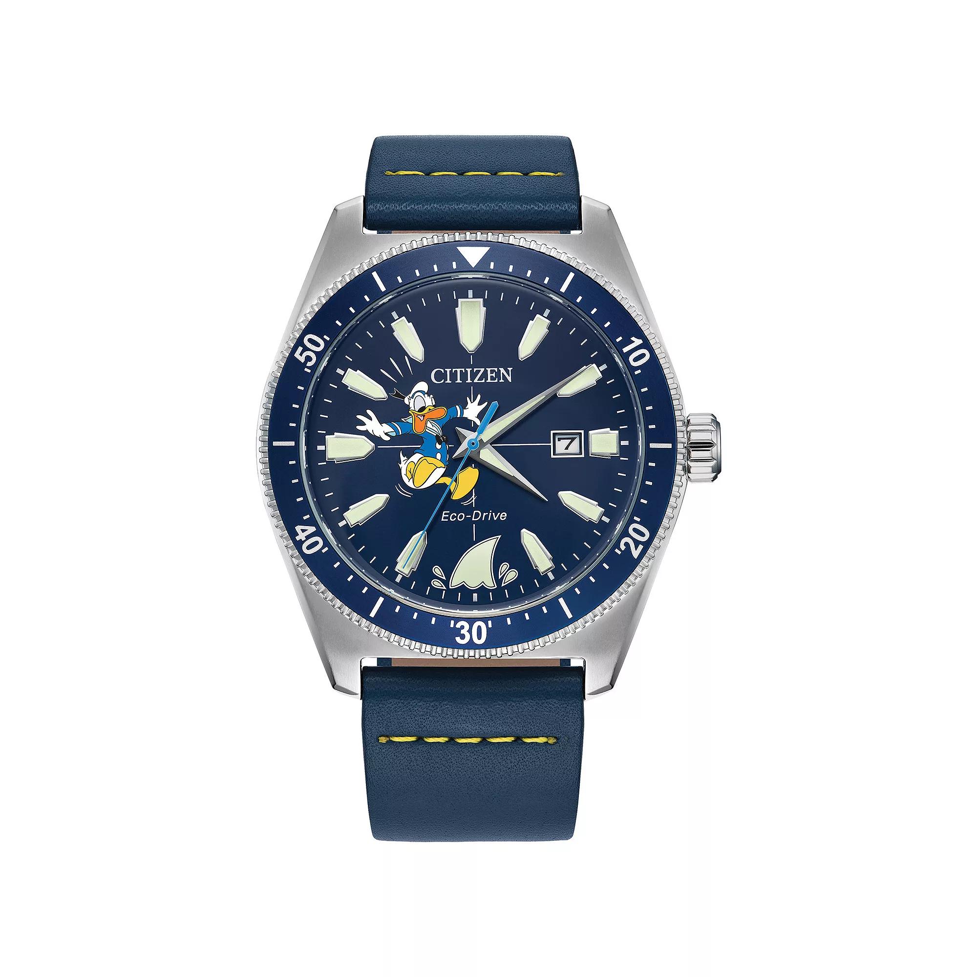 The 1930s brought along one of Mickey Mouse’s beloved sidekicks, Donald Duck. A mischievous and temperamental counterpart that always found himself in a predicament, as captured on the dial of this watch. Donald scurries above as a shark swims swiftly beneath him at the 6 o’clock. This standout style boasts a tone-on-tone navy blue dial with a navy-blue leather strap and contrast yellow stitching on a silver-tone stainless steel case. Don’t be alarmed but the shark, and indices, glow brightly in the dark. Water resistant to 100 meters and powered by Eco-Drive technology that never needs a battery. | Citizen Mens Mickey Mouse & Friends Donald Duck Strap 42Mm, No Size