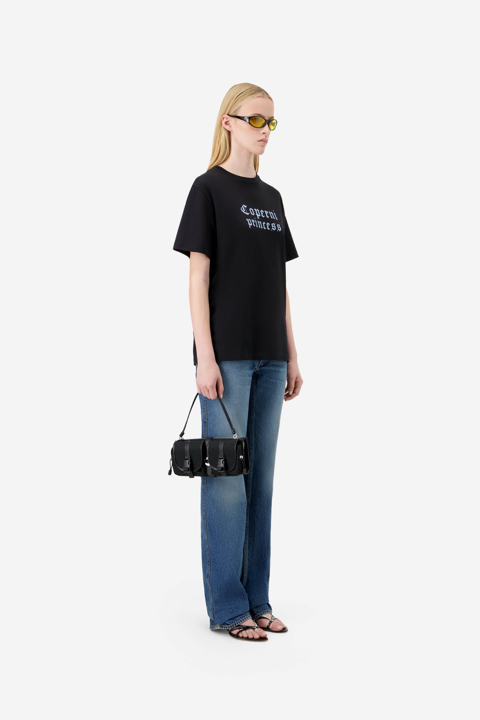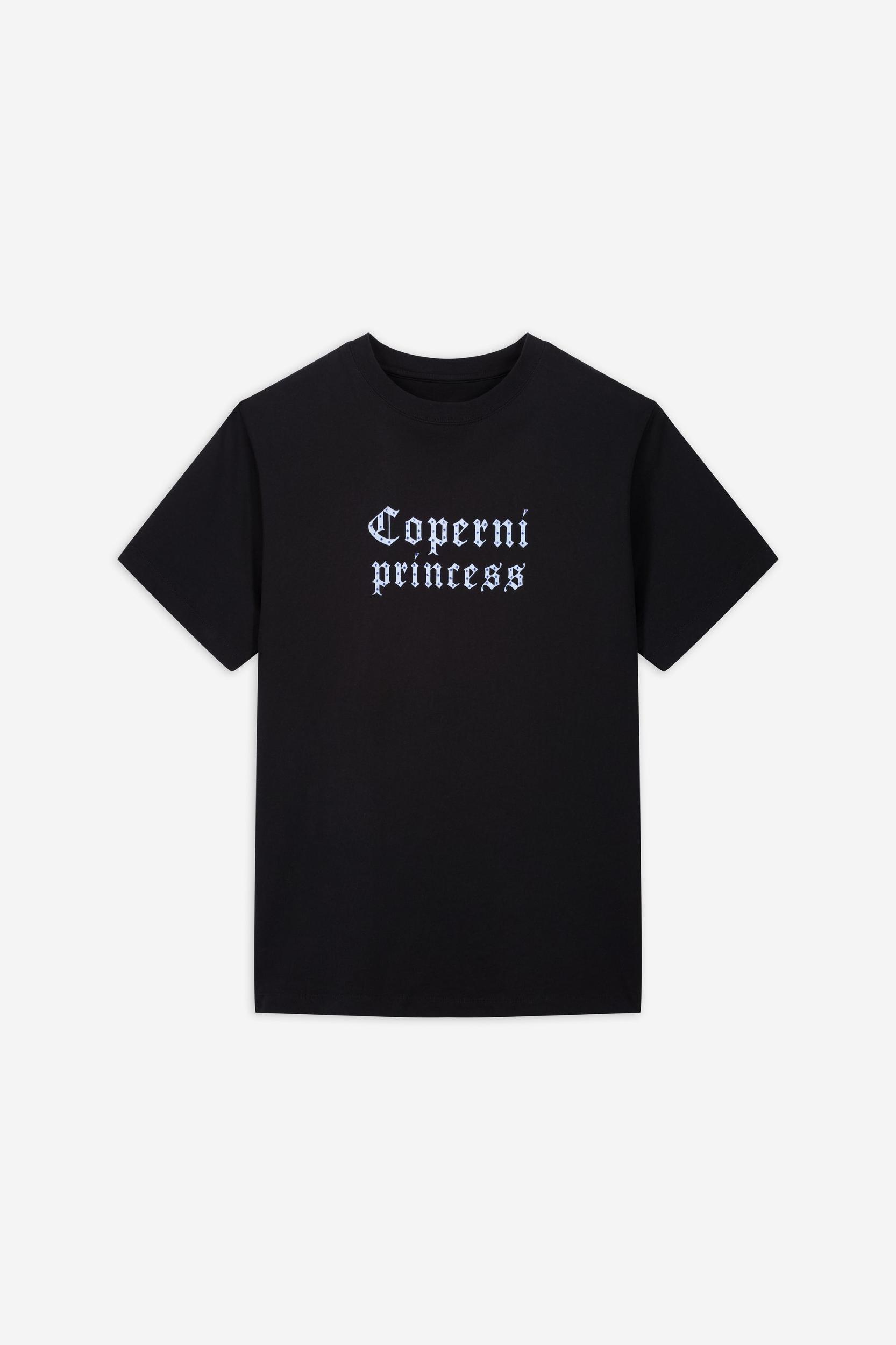 A playful nod to fairytale nostalgia, this boxy t-shirt features a gothic-style Coperni princess print in icy blue. Cut from pure cotton, its oversized silhouette and structured shoulders give it a modern, street-ready feel that balances softness with statement. A subtle logo at the back adds a final branded note.