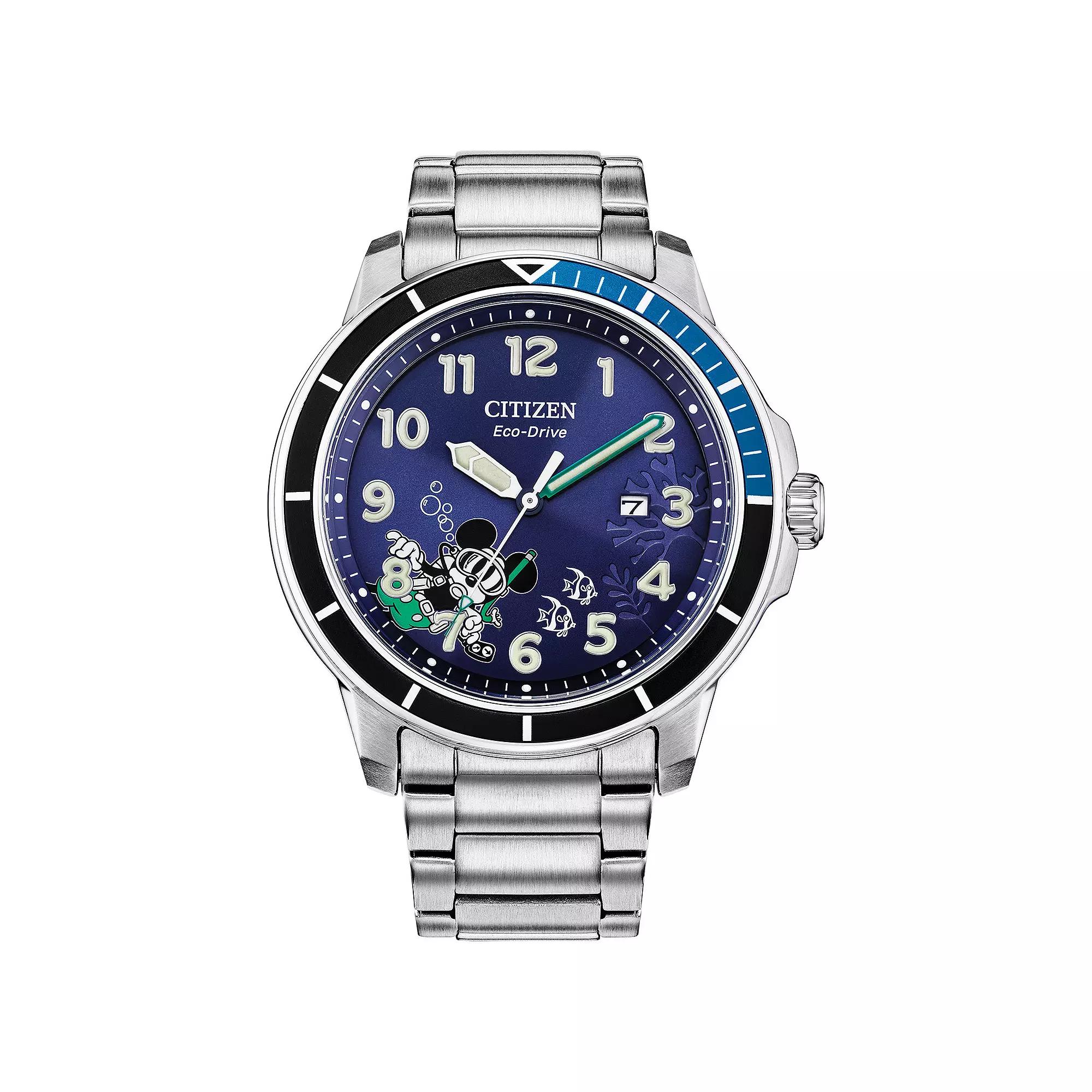 Make a splash in this Disney Mickey Mouse Water Sport timepiece from CITIZEN. A classic, dive-inspired silhouette features a stainless steel case and bracelet, luminous hands and markers, and a bezel in two shades of blue and a navy blue dial. A scuba-clad Mickey Mouse peeks out from between the 8 and 7 o'clock markers within an underwater scene, designed by Disney Imagineer Jeff Shelly. Citizen watches are powered by any light with Eco-Drive technology and never need a battery. ©Disney | Citizen Men's Mickey Water Sport Bracelet Watch