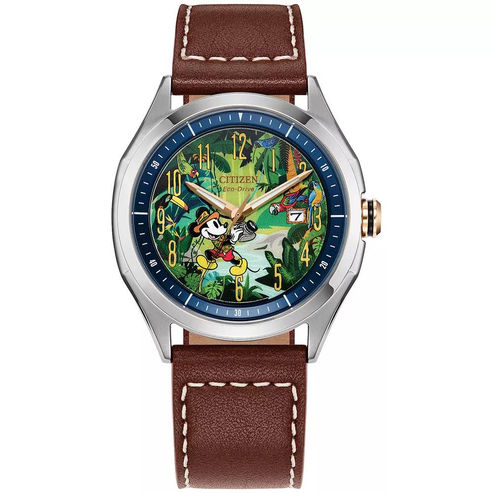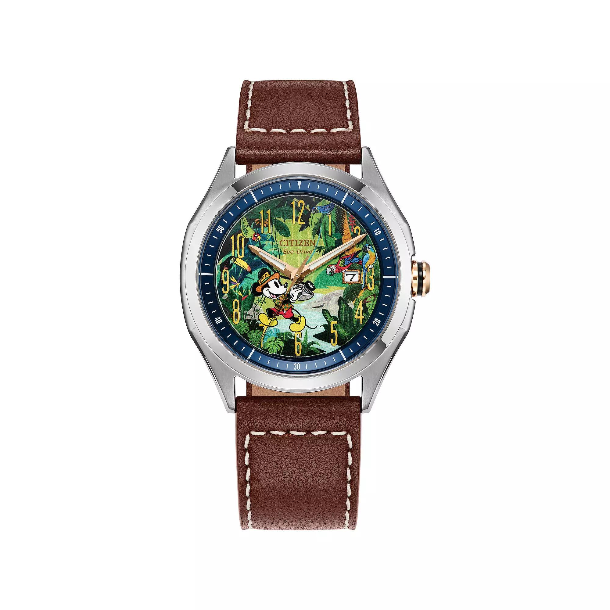 Disneys Mickey Mouse Explorer Citizen Mens Eco-Drive Stainless Steel Brown Leather Strap Watch - AW1149-06W