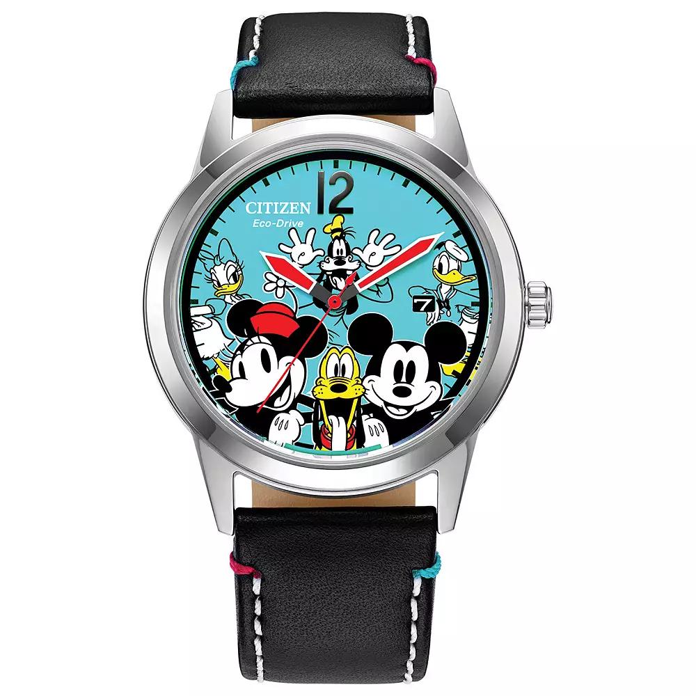 Citizen’s Disney Sensational Six timepiece features some of Disney’s most recognized characters: Mickey Mouse, Minnie Mouse, Donald Duck, Daisy Duck, Goofy and Pluto. The unisex watch features exclusive artwork that captures the essence of their fun-loving personalities. The Disney watch features a black leather band with contrast stitching to match the dial and is sustainably powered by light with Citizen’s Eco-Drive technology. ©Disney | Citizen Eco-Drive 40 Millimeter Disney Sensational Six Black Strap Watch