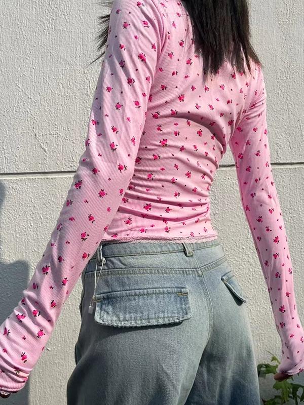 Ditsy Floral Print Square Neck Lace Trim Long Sleeve Knit