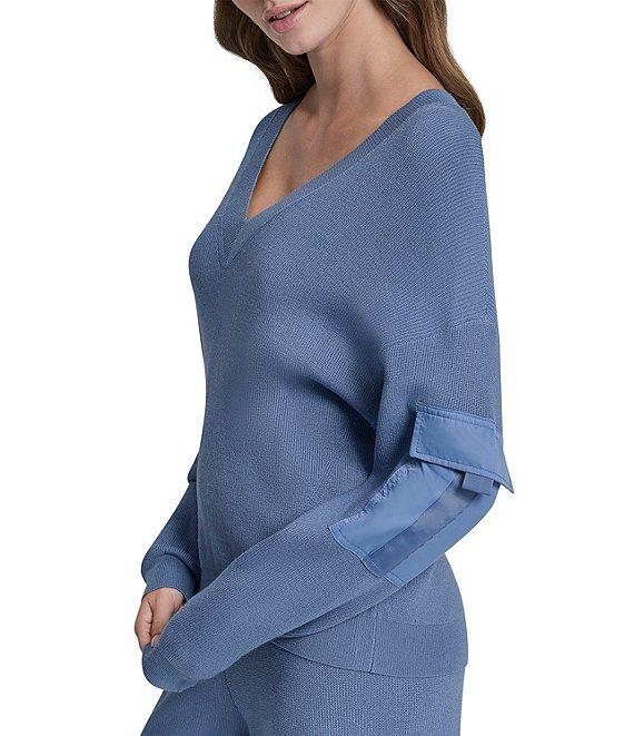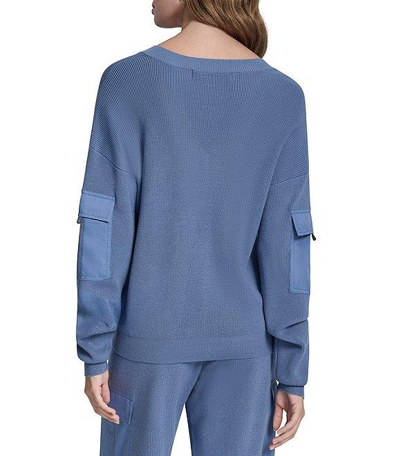 From DKNY by Donna Karan, this top features: Knit fabrication V-neckline Long sleeves Satin patch pockets on sleeves Ribbed hem and cuffs Straight hemline Pullover construction Approx. 22" length Viscose rayon/polyester/nylon Hand wash/line dry Imported.