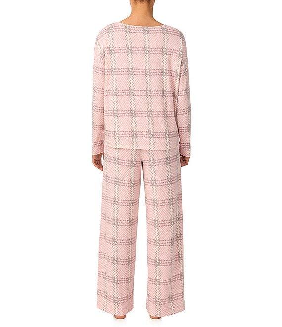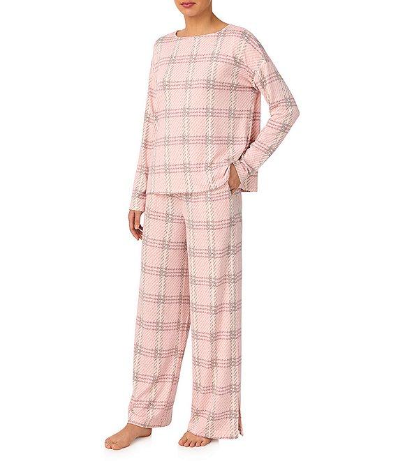From DKNY by Donna Karan, this lounge set features: Top: Knit fabrication Plaid print Boat neckline Long sleeves Side slits Pullover construction Approx. 24.5" length Polyester/spandex Machine wash cold/tumble dry low Bottom: Matching pant Plaid print Elastic waistband Side pockets Pull-on construction Approx. 31" inseam Polyester/spandex Machine wash cold/tumble dry low Imported.
