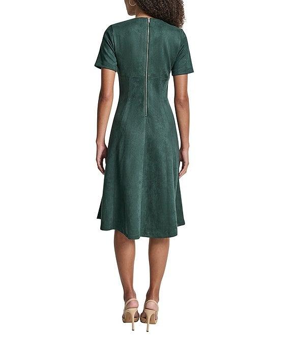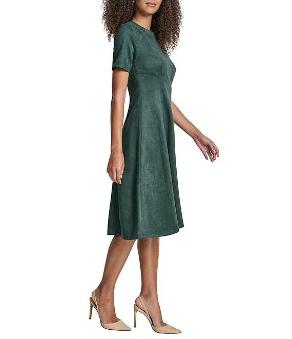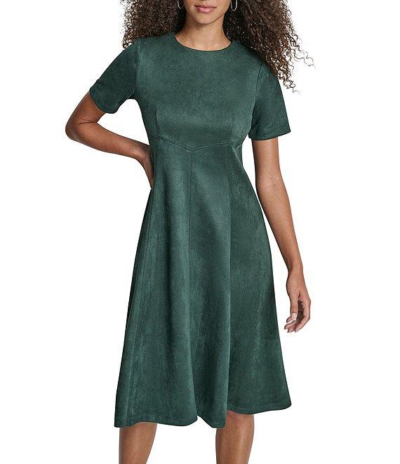From DKNY by Donna Karan Petite, this dress features: Scuba suede fabrication Crew neckline Short sleeve Flounce hem Fit and flare silhouette Midi dress Center back zipper closure Approx. 42.5" in length Polyester/spandex Dry clean Imported.