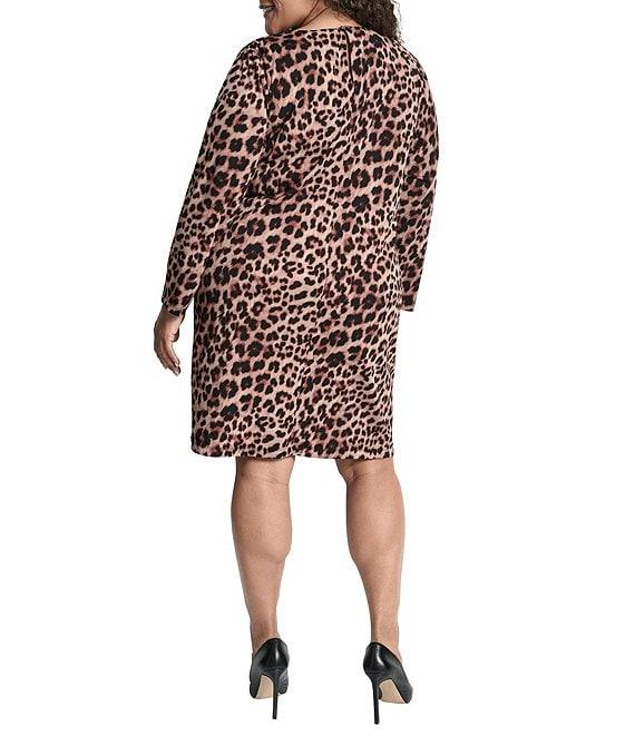 From DKNY by Donna Karan Plus, this dress features: Jersey fabrication Round neckline Long sleeves Ruched bodice D-buckle hardware Above the knee Hook and eye center back closure Approx. 39" in length from high point shoulder Polyester Dry clean Imported.