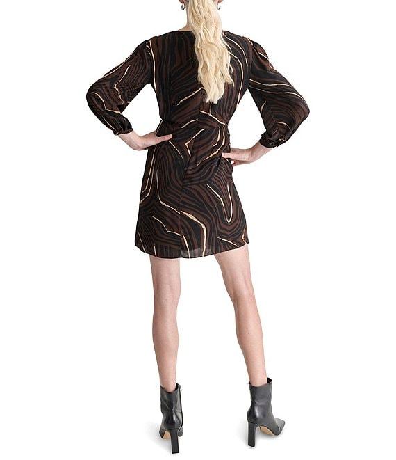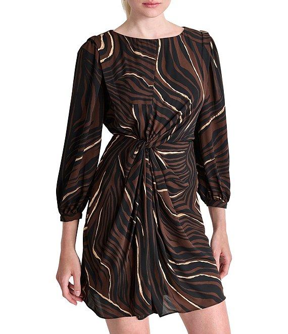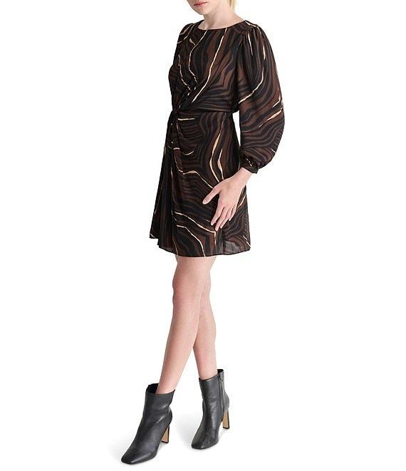 DKNY by Donna Karan Printed Boat Neck Long Balloon Sleeve Twist Front Mini Dress