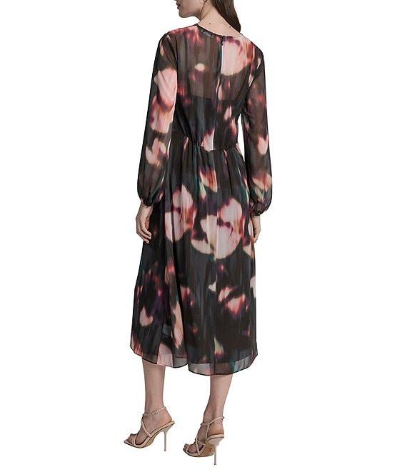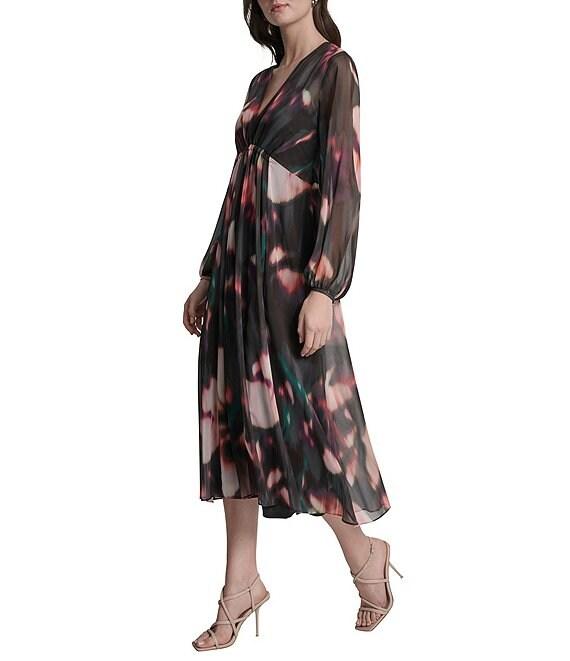 DKNY by Donna Karan Printed Chiffon V-Neck Long Balloon Sleeve Empire Waist Midi Dress