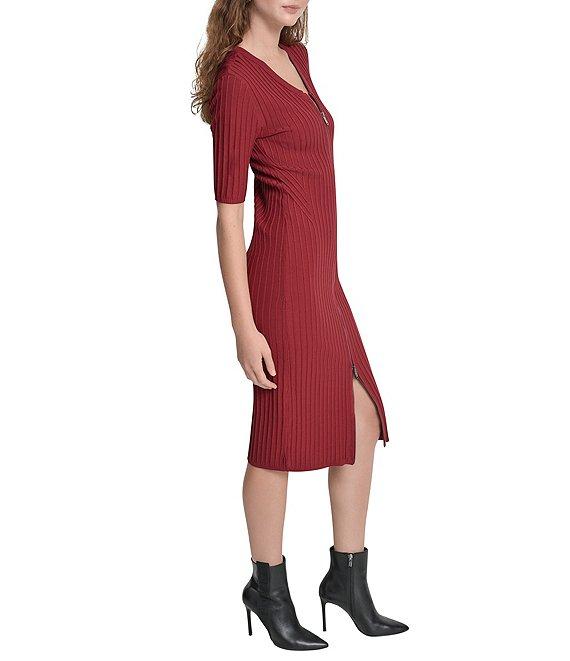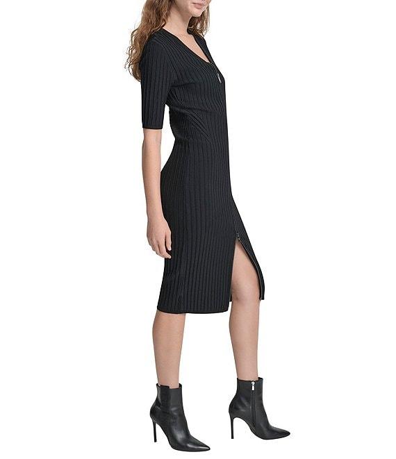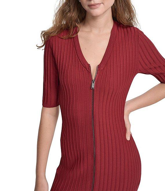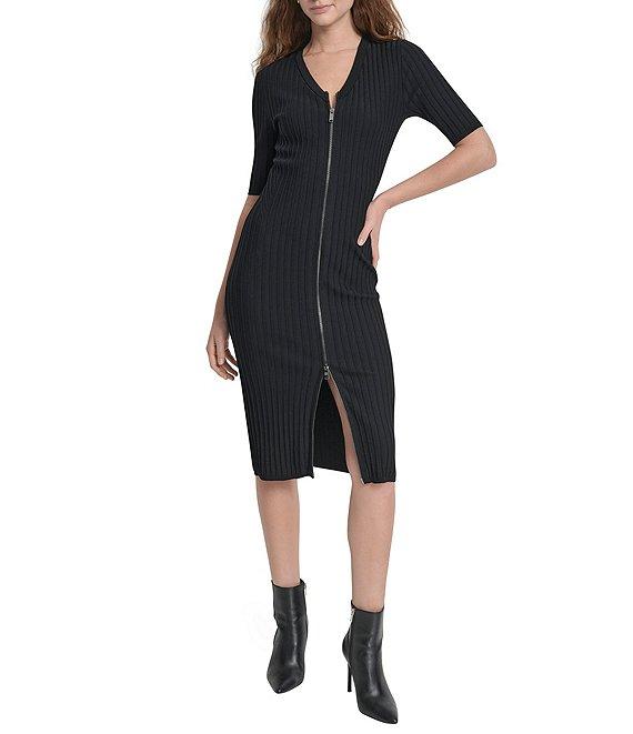 DKNY by Donna Karan Ribbed Knit V-Neck Short Sleeve Zip Front Midi Sheath Dress