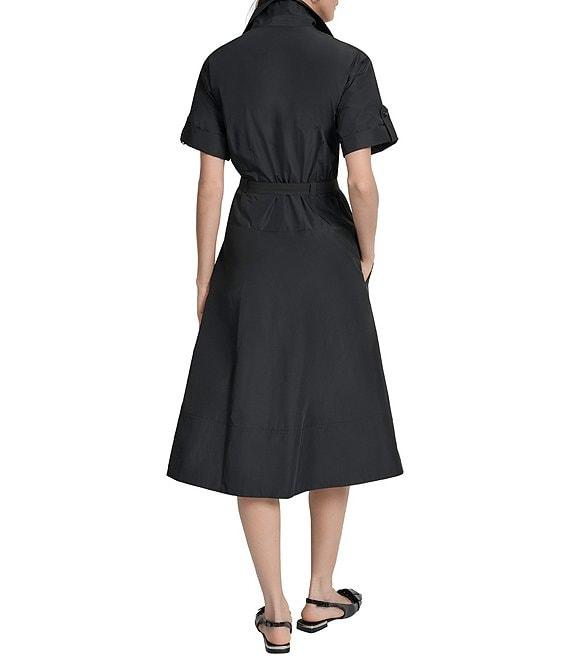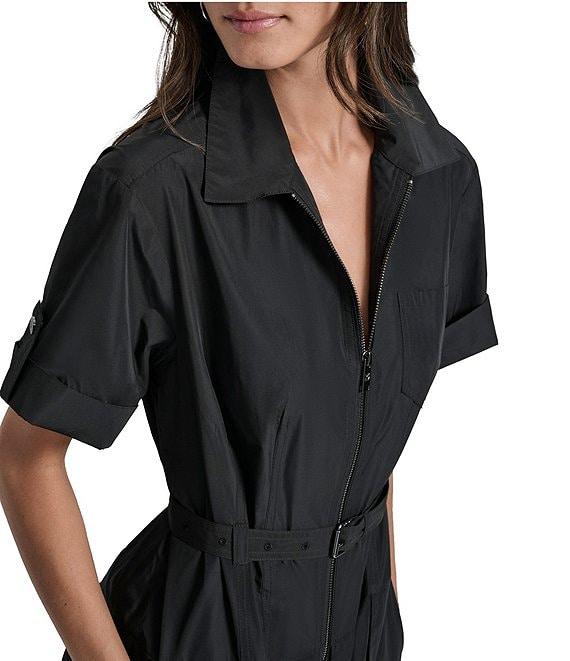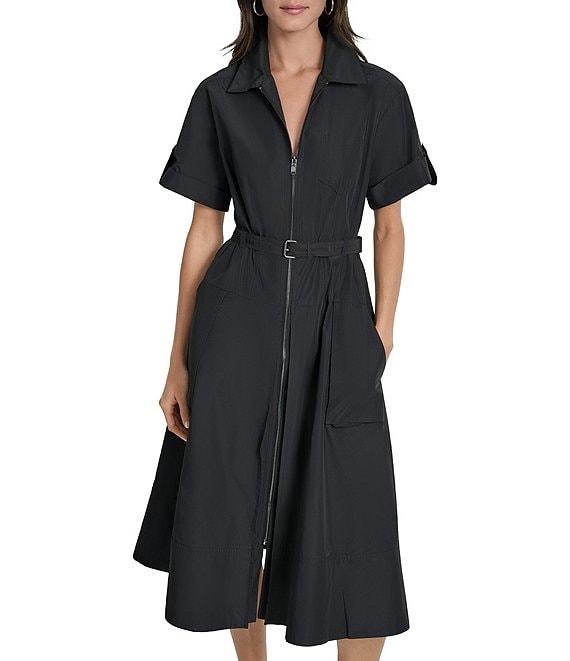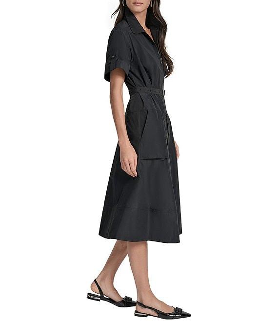 From DKNY by Donna Karan, this dress features: Taffeta fabrication Point collar Short sleeves Removable belt Cargo style pockets Zip front closure Approx. 46.5" length Polyester Machine wash/tumble dry Imported.