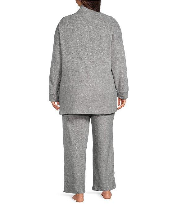 From DKNY Plus, this pajama set features: Top: Fleece fabrication Long sleeves Open front neckline Patch pockets Approx. 31.5" length Polyester/spandex Machine wash cold/tumble dry low Bottom: Matching pant Fleece fabrication Elastic waistband Side seam pockets Pull-on construction Approx. 31.5" inseam Polyester/spandex Machine wash cold/tumble dry low Imported.